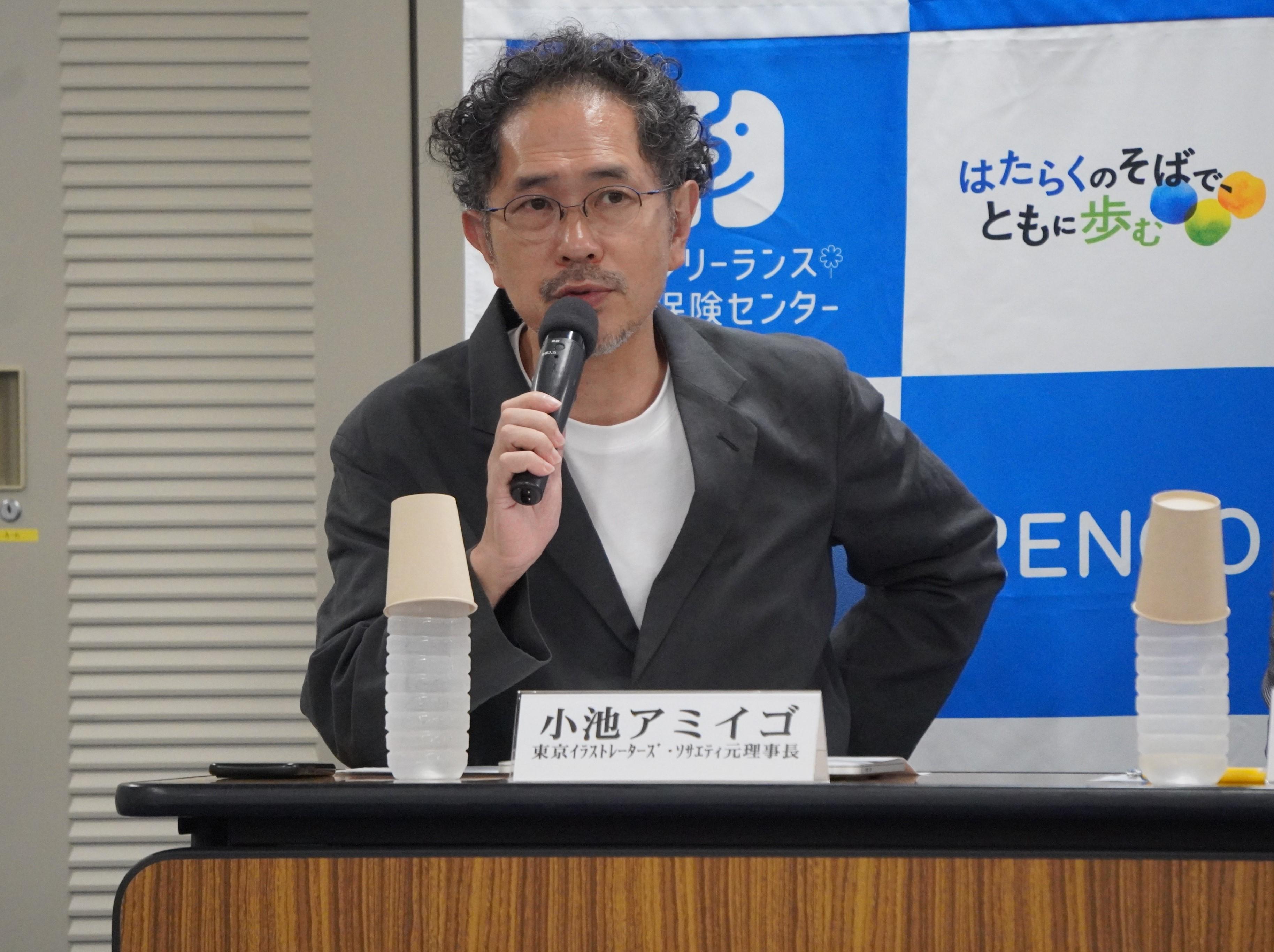 また、フリーランスのイラストレーターである小池アミイゴさん(TIS元理事長)からは、「今までイラストレーターとしての仕事をする中で、発注者との打ち合わせやアイデア出しなど無償でやっていることもあったが、そこに対してもしっかりと対価が支払われるように明記されたことは大きな前進である。イラストレーターの仕事は、「好きでやっている」などと言われることもあるが、イラストレーターも立派な労働なんだということを感じた。またイラストレーションは人を幸せにする仕事だと思っており、イラストレーターがいい仕事をするためにも『契約書のひな形』は役立つものと期待している」と思いを述べました。