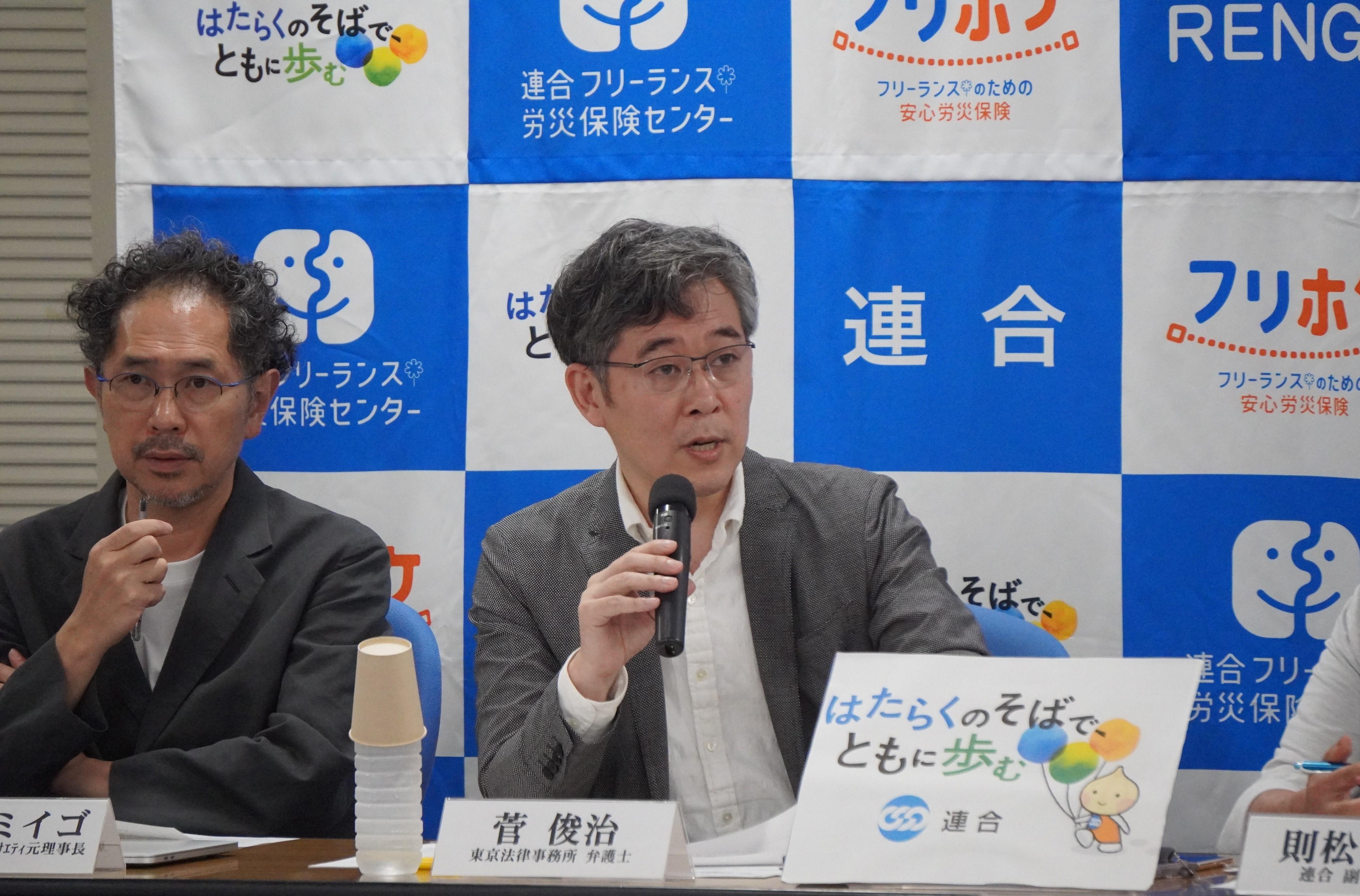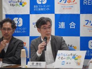 続いて、菅弁護士(東京法律事務所)より「契約書のひな形」について説明がありました。菅弁護士は、「労働組合の連合が作る『契約書のひな形』であるため、働く者の視点で公正な取引慣行を実現するという思いで策定を行った。またクリエイターの方々の才能や努力、労働に対してしっかりと報酬が支払われるとともに、きちんと職業生活が送れることを意識して策定した」と述べました。