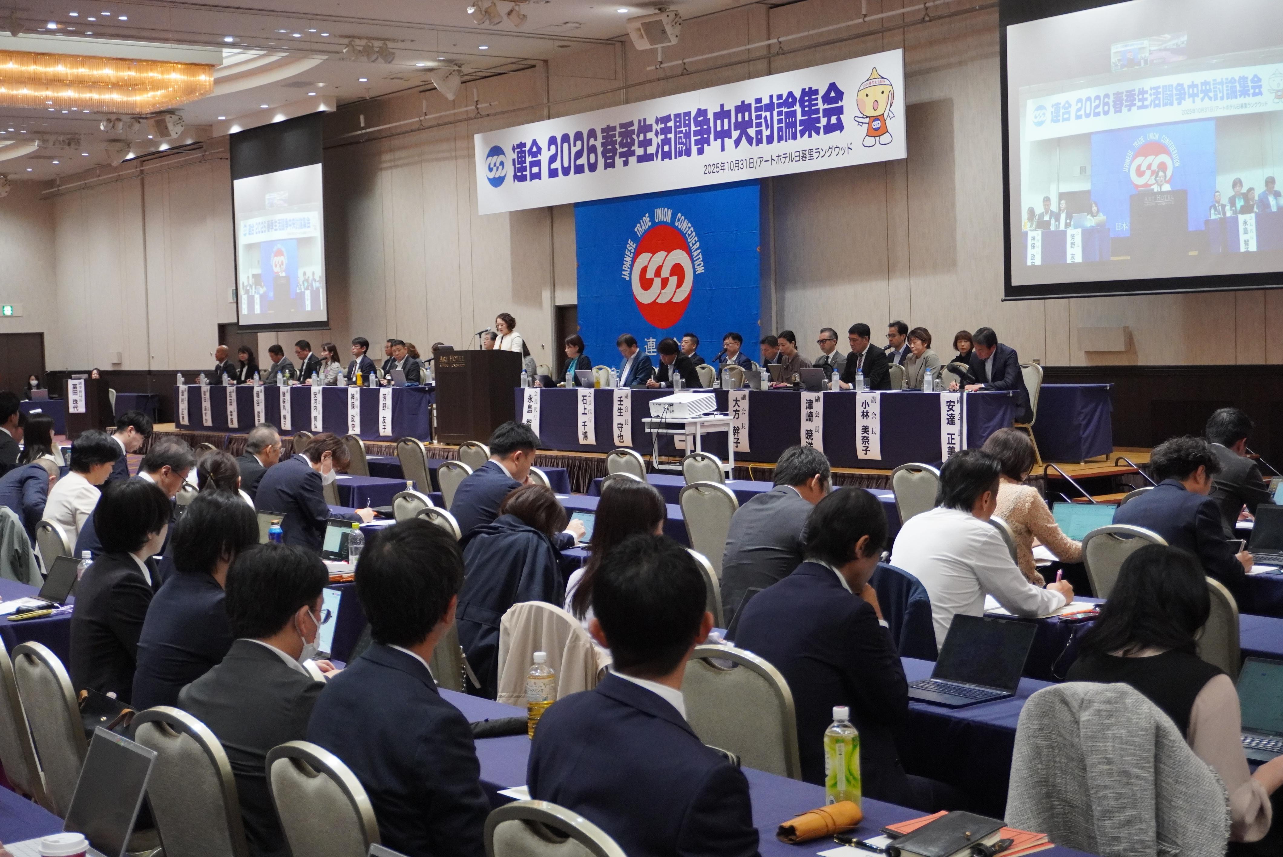 連合は10月31日、アートホテル日暮里ラングウッドにおいて2026春季生活闘争中央討論集会を開催しました。同集会には、構成組織、地方連合会および関係団体などから574名(会場:192名、Web:382名)が参加し、第1回中央執行委員会(10月23日)で確認した2026春季生活闘争基本構想にもとづいて活発な討議を行いました。