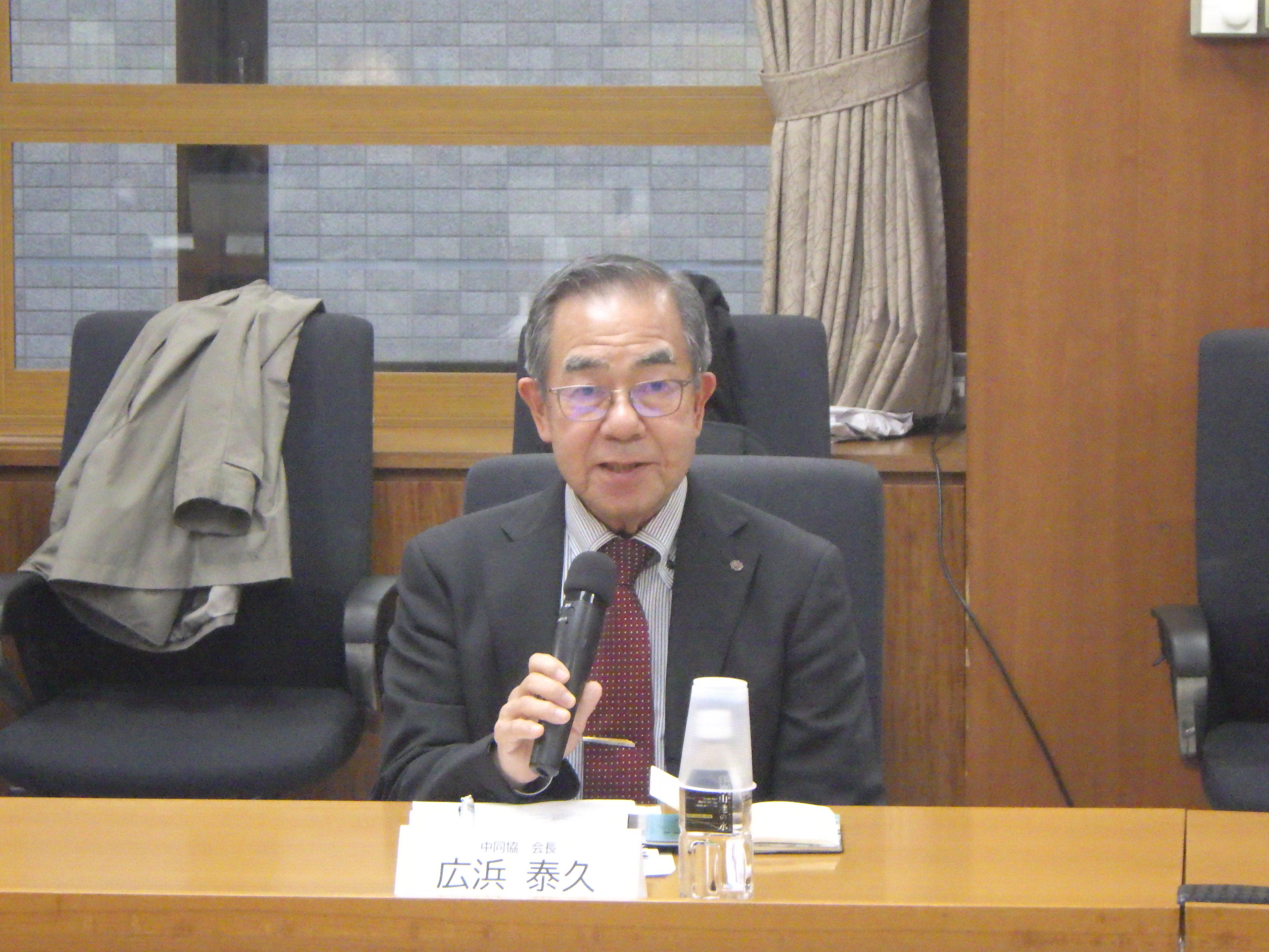 続いて中同協の広浜会長が挨拶し、「連合の皆さんとの意見交換は、今回で第12回目を迎える。貴重な意見交換の機会を設けていただき、感謝申し上げる。中同協は人間尊重の経営をモットーとし運動を展開してきた。お互いの組織や取り組みを知ることにより、運動の後押しとなるような意見交換を重ねてきた。中小企業振興基本条例は、全国各地で取り組みを進めていたものの、東京都では前進させることが難しいと思っていた。連合の皆さんと連携することで形にできた。自組織のみの力では達成できるものではない。春季生活闘争では、大企業を中心に満額回答が多く聞かれるが、中小企業も当然にして賃上げを進めていかなければ人財確保が難しくなるなど、厳しい状況に置かれている。このようなときこそ、自らが努力し、経営状況に向き合ったうえで、地域の発展につなげていく必要がある。そのうえで、自分たちだけでは解決できない課題についても、力を合わせて全体で進めていきたい」と述べました。