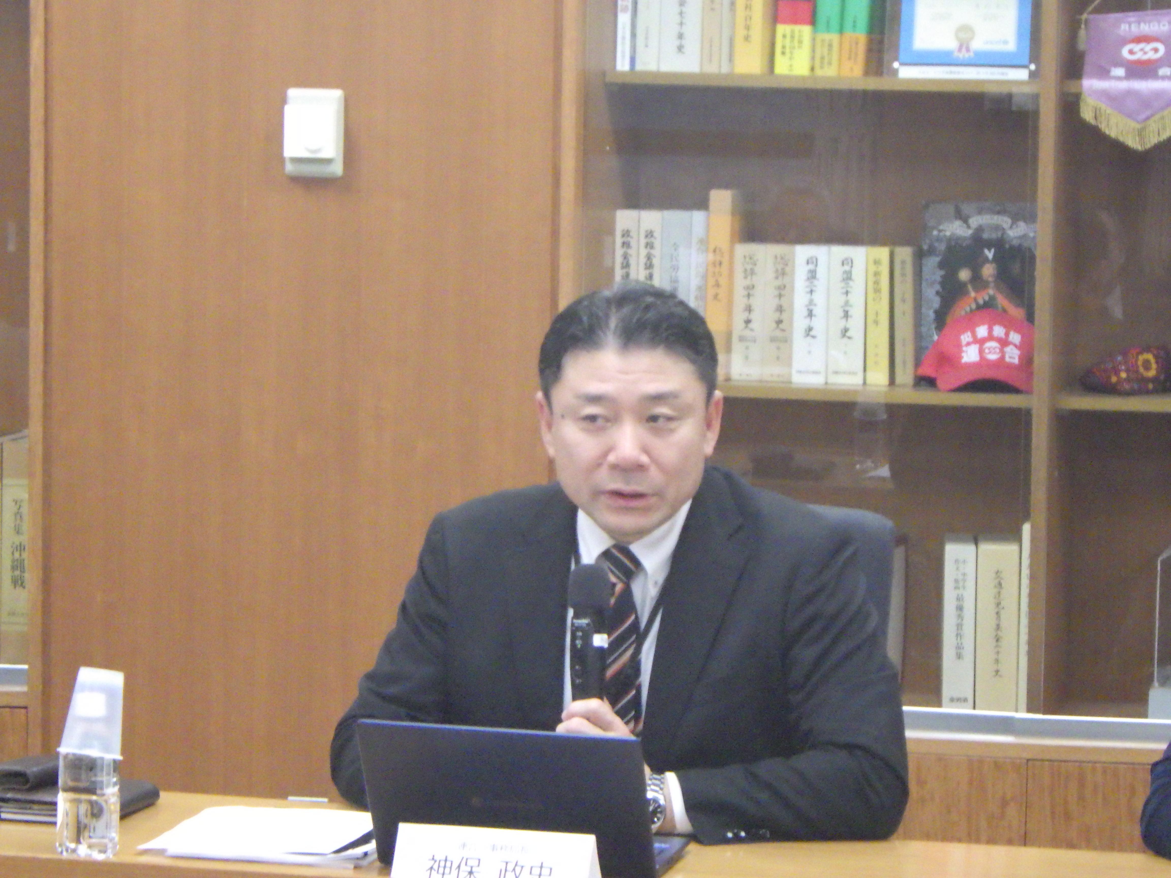 冒頭、神保事務局長は、「中小・小規模事業者の公正取引と持続的に物価を上回る賃上げができる環境整備に向けた共同談話」を、両組織で事前に準備を進め、双方の組織内に展開している。この共同談話の取り組みは、今回で4回目であり、重ねて感謝申し上げる。連合は『こだわろう!くらしの向上 ひろげよう!仲間の輪』のスローガンのもと、2月から多くの組合が要求書を提出し、昨日3月23日に第1回回答集計結果を公表した。全体は5.26%の引き上げとなり、特に注目される中小組合・300人未満の規模では5.05%と5%を上回る集計結果となった。日本全体の実質賃金が持続的に上昇し、多くの仲間が生活向上を実感できるようになるかの正念場である。中同協と連合が、さらに連携を強化し、中小企業の経営基盤の強化と、地域活性化に向けて共に取り組む」と挨拶しました。