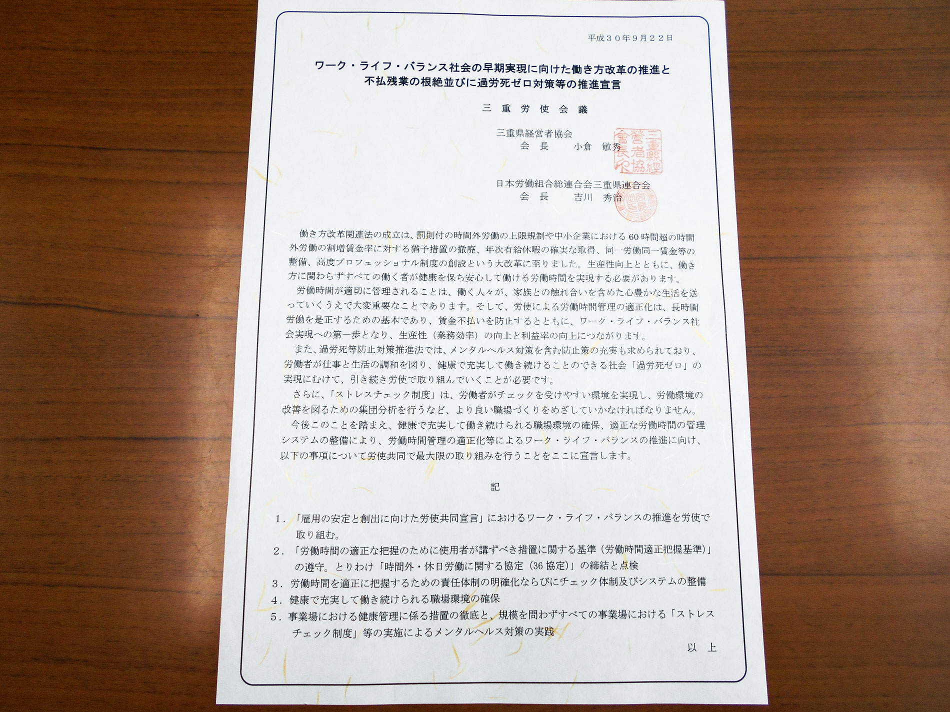 今後このことを踏まえ、健康で充実して働き続けられる職場環境の確保、適正な労働時間の管理システムの整備により、労働時間管理の適正化等によるワーク・ライフ・バランスの推進に向け、以下の事項について労使共同で最大限の取り組みを行うことをここに宣言します。