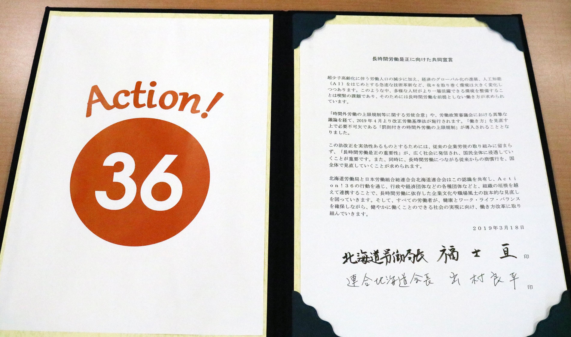 連合北海道と北海道労働局は3月18日、札幌市内で「長時間労働の是正に向けた共同宣言」を締結し、組織の垣根を越えて連携して長時間労働に依存した企業文化や職場風土の抜本的な見直し等に向けて取り組むことを確認した。この日の締結には北海道労働局から福士局長、連合北海道は出村会長が出席し、共同宣言にそれぞれ署名。福士労働局長は「今後、連携して取り組みを進めたい」と語った。連合北海道は今後も経済団体等との締結に向けて事務レベルでの作業を進め、長時間労働是正の重要性を道民全体に広めていく。