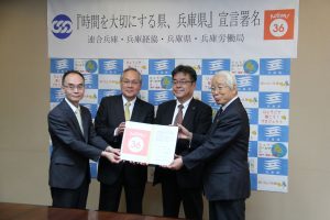 連合兵庫、兵庫県経営者協会、兵庫県、兵庫労働局は、ここに、『時間を大切にする県、兵庫県!』を宣言し、地域にかかわるすべての人にとって、「働く時間」「生活する時問」「休息する時問」のそれぞれの価値を高めていくことに取り組みます。
