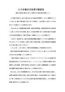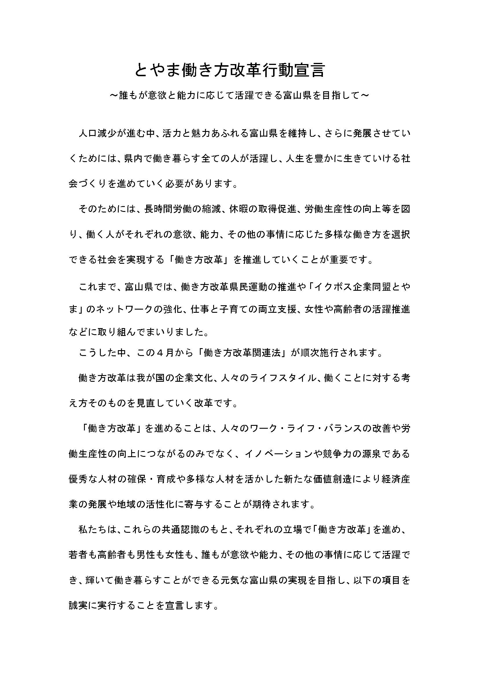 富山県内における経済団体・労働団体・有識者・行政等が、それぞれの立場で「働き方改革」を進め、若者も高齢者も男性も女性も、誰もが意欲や能力、その他の事情に応じて活躍でき、輝いて働き暮らすことができる元気な富山県の実現を目指し、5つの項目を誠実に実行することを宣言する「とやま働き方改革行動宣言」を採択しました。
