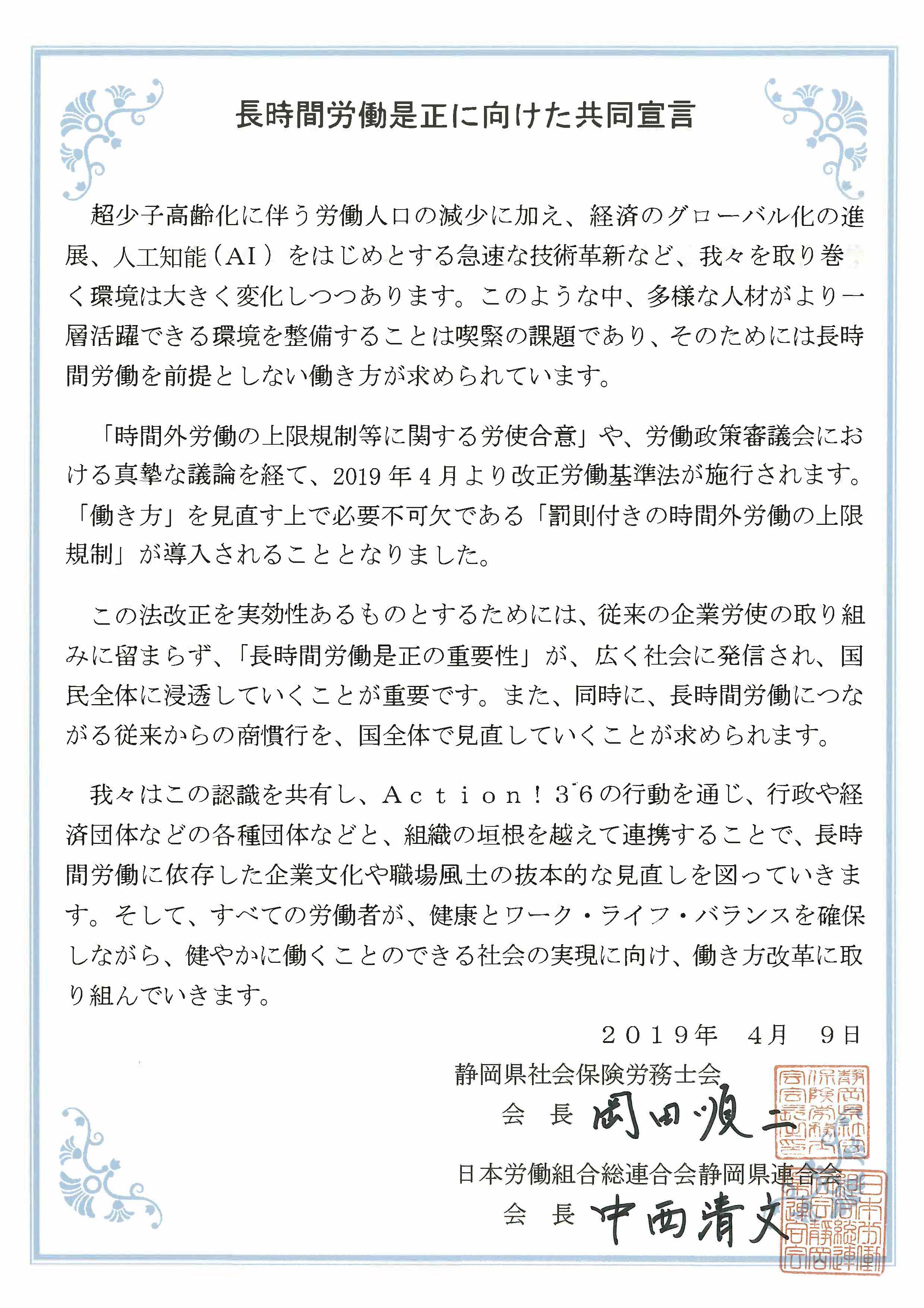 長時間労働の是正に向けた共同宣言 静岡県社会保険労務士会との長時間労働是正に向けた共同宣言 2019.04.09 2019年4月9日、静岡県社会保険労務士会との長時間労働是正に向けた共同宣言を締結しました。参加者は、中西会長、角山事務局長、町田副事務局長(労働政策局長)