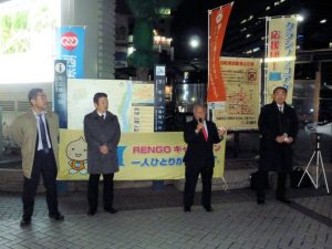 2月20日(水)、西湘地域連合では、〈Action!36〉クラシノソコアゲ応援団RENGOキキャンペーン活動を平塚駅前で実施しました。西湘地域連合・齊藤議長、連合神奈川・金井副事務局長、地域連合推薦議員のマイクリレーと周知チラシの配布で、36(サブロク)協定の周知と本年4月より施行される働き方改革関連法案の内容など、残業に関する36協定を見つめなおしてもらおうと西湘地域連合推薦議員の皆さんも一緒に訴えかけました。