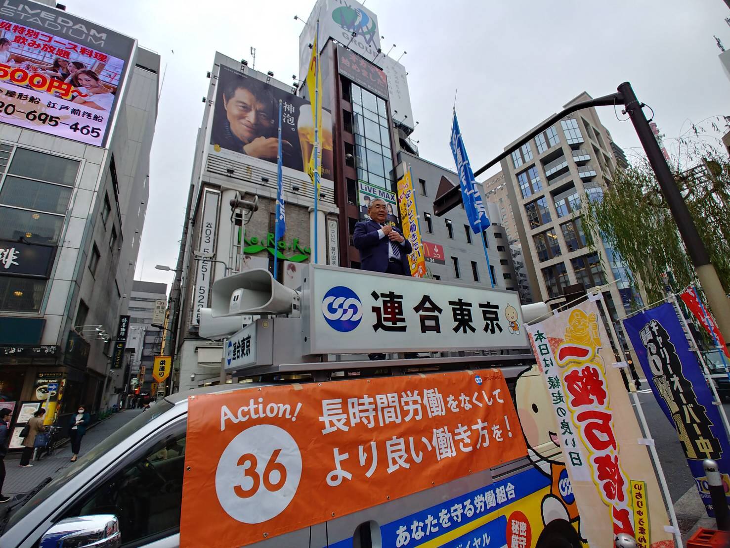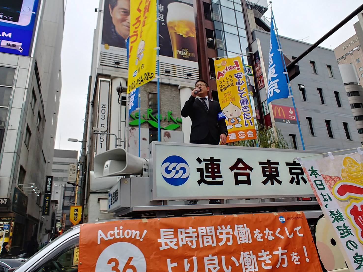 お知らせ・イベント 連合東京3.6早朝街宣行動に続いて、お昼の街宣行動の実施! 2019.03.06 3月6日は36(サブロク)協定の日】早朝街宣行動に続いてお昼は新橋へ! 「長時間労働で悩んでいませんか?まずは職場で36協定をチェックしてみてくださいね!」「時間外労働や休日労働をさせる場合、36協定届を労基署へ届けなくてはなりません!」と訴えました。