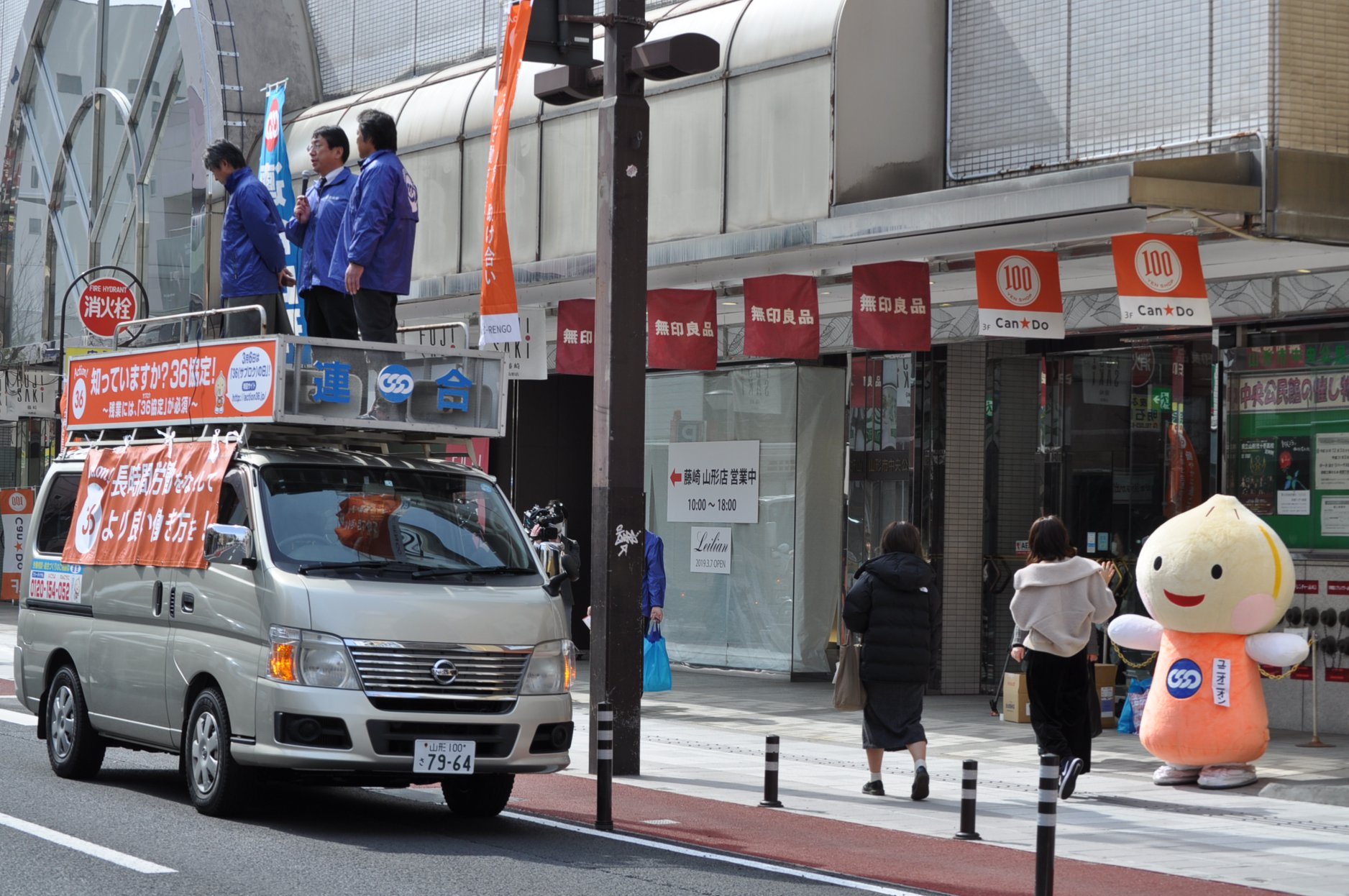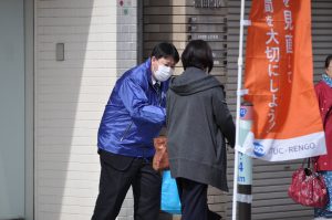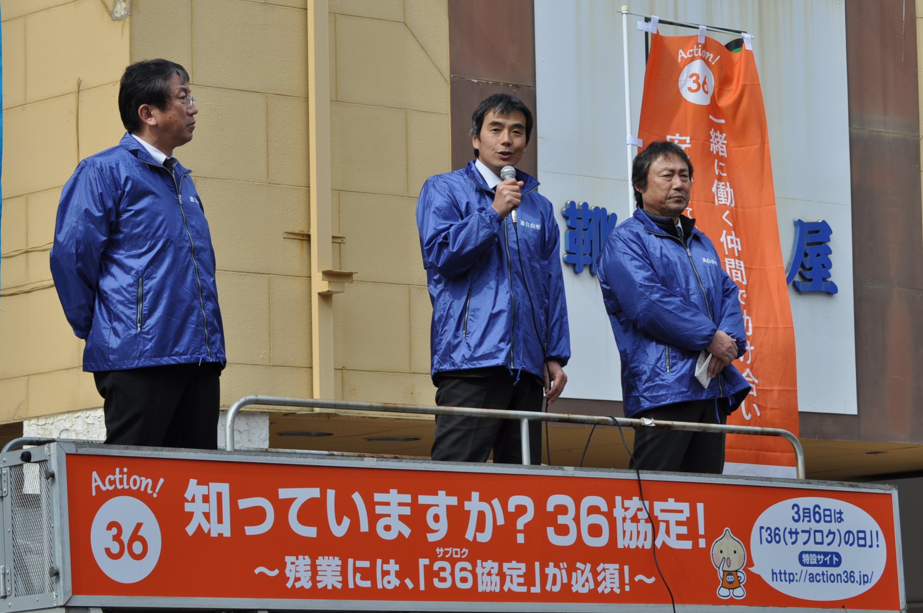 お知らせ・イベント 連合山形「36(サブロク)の日」周知行動の実施! 2019.03.06 3月6日は36(サブロク)の日! この日、「36(サブロク)の日」について記者会見をした後、山形市アズ七日町前で街頭宣伝行動を展開しました。街頭宣伝行動では、水戸連合山形会長、小口会長代行、安孫子連合山形地協議長がマイクを握り、鈴木組織広報部長の司会により36協定の意義、長時間労働の是正などについて訴えました。チラシや「サブロクのアメ」も配布し、多くの市民の方々が受け取っていました。
