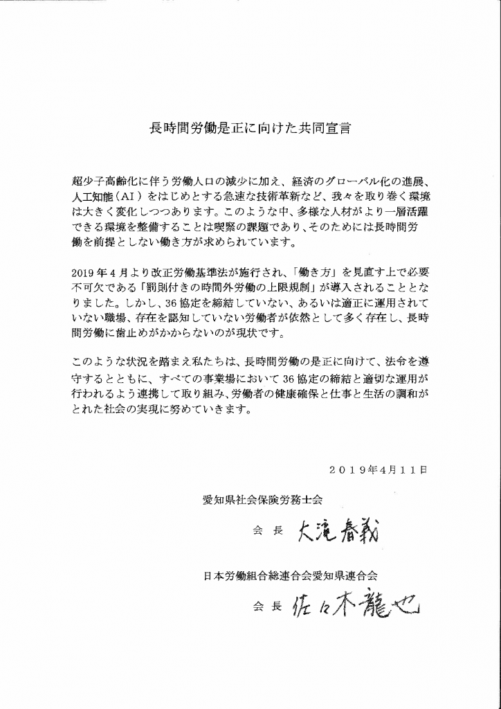 愛知県社会保険労務士会との長時間労働是正に向けた共同宣言