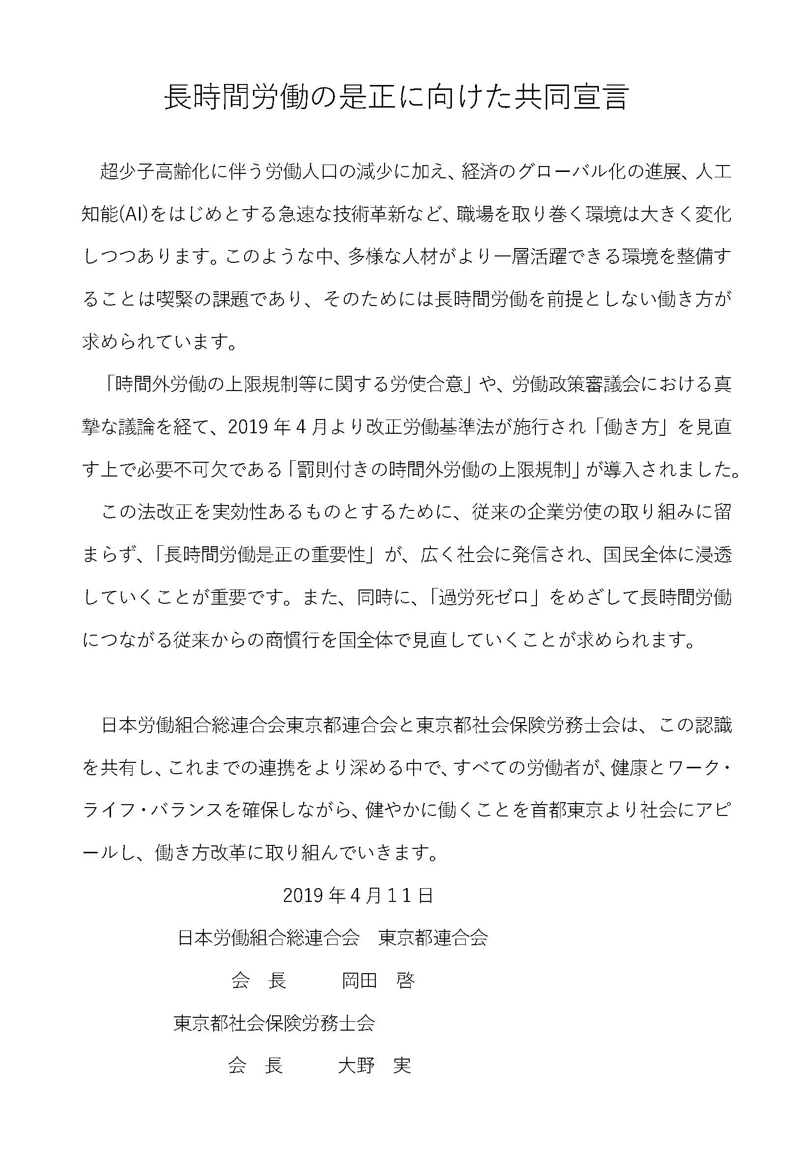 「長時間労働の是正に向けた共同宣言」を確認