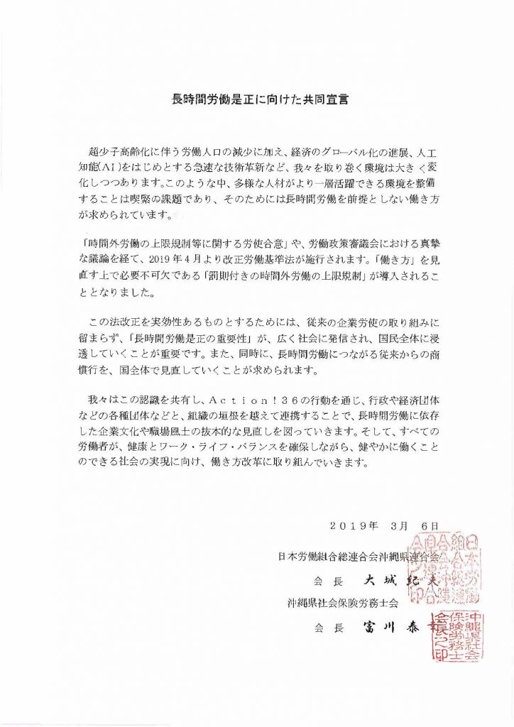 長時間労働の是正に向けた共同宣言 沖縄県社会保険労務士会との長時間労働是正に向けた共同宣言 2019.03.06 当日は、社労士会の富川泰幸会長が出席し、沖縄労働局や中小企業団体中央会、中小企業家同友会、経営者協会、弁護士会も共に長時間労働の是正や36協定の締結など共に県民へ周知し取り組むことを確認した。