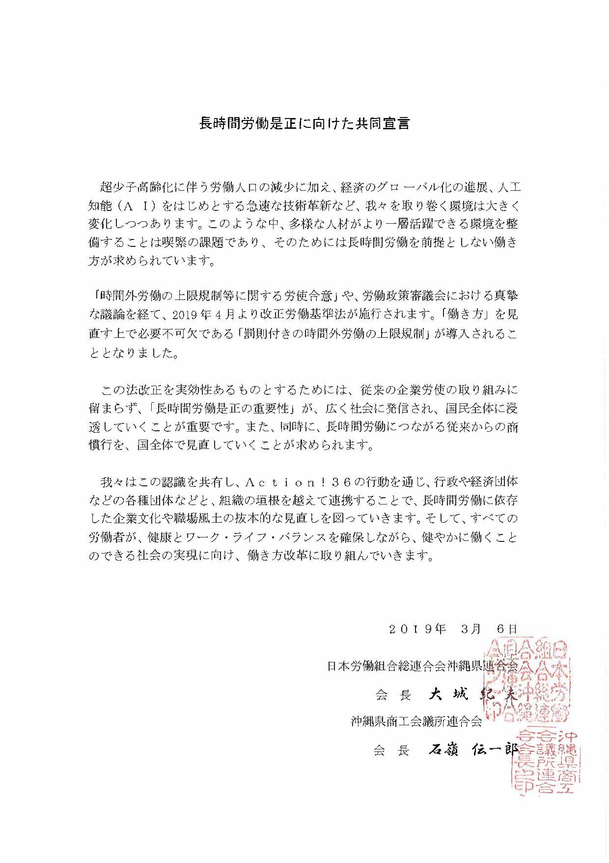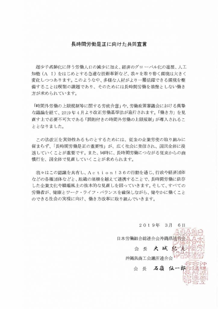 長時間労働の是正に向けた共同宣言 沖縄県商工会議所連合会との長時間労働是正に向けた共同宣言 2019.03.06 当日は、商工会議所の石嶺伝一郎会頭は出席できなかったが、2019春闘要請(3/28)の前段で「Action!36」の共同宣言に向けて商工会議所連合会としても会員へ長時間労働の是正に向け対応していく旨のコメントを頂いた。