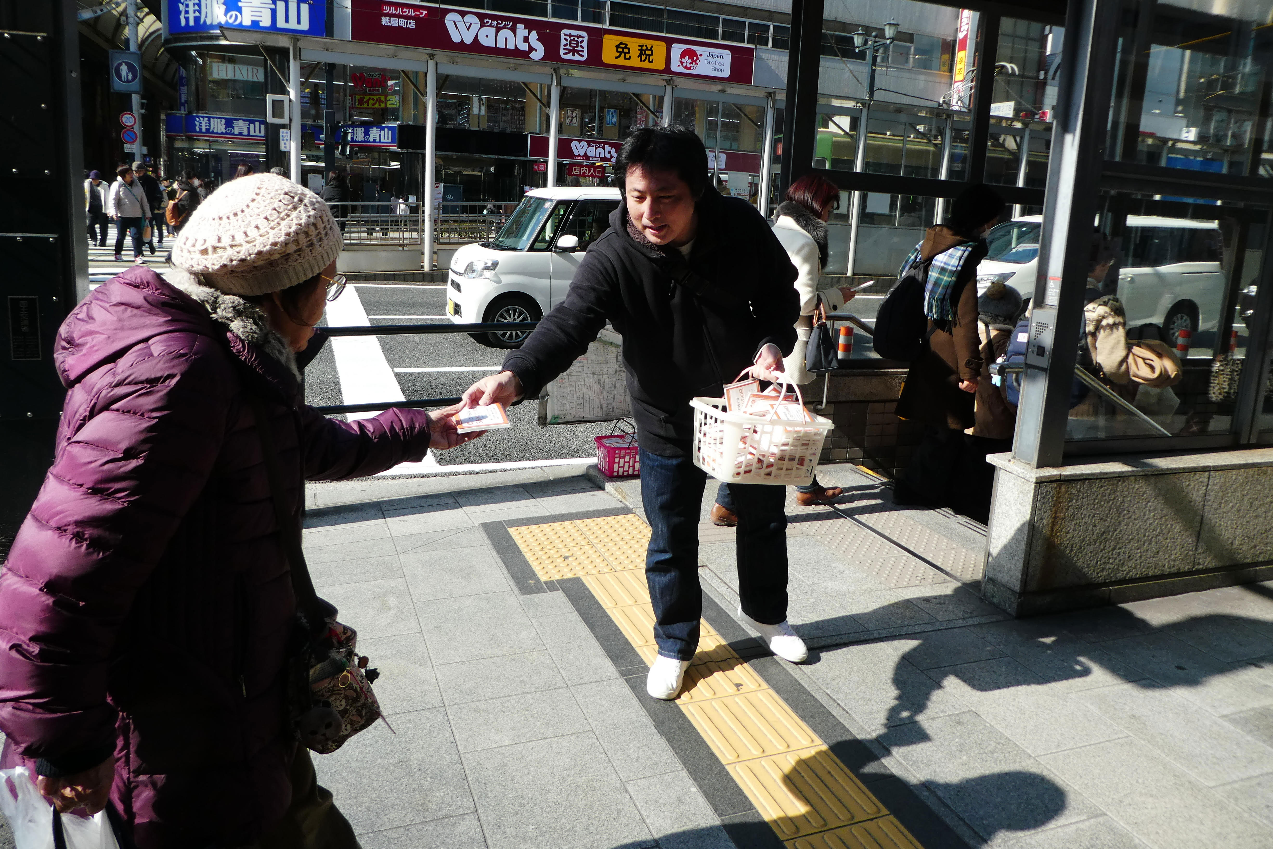 内にて商店街でのデモ行進とチラシ入りティッシュの配布を行い、