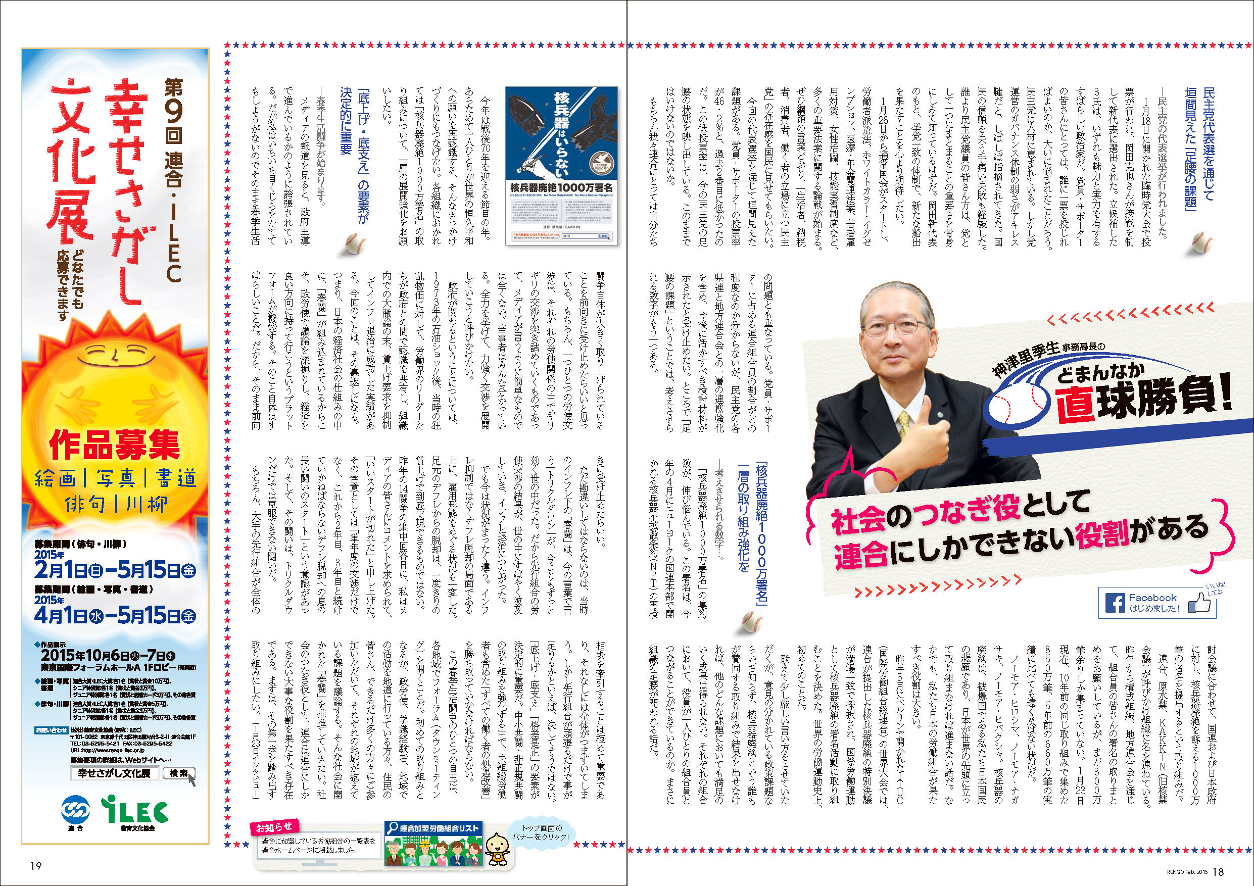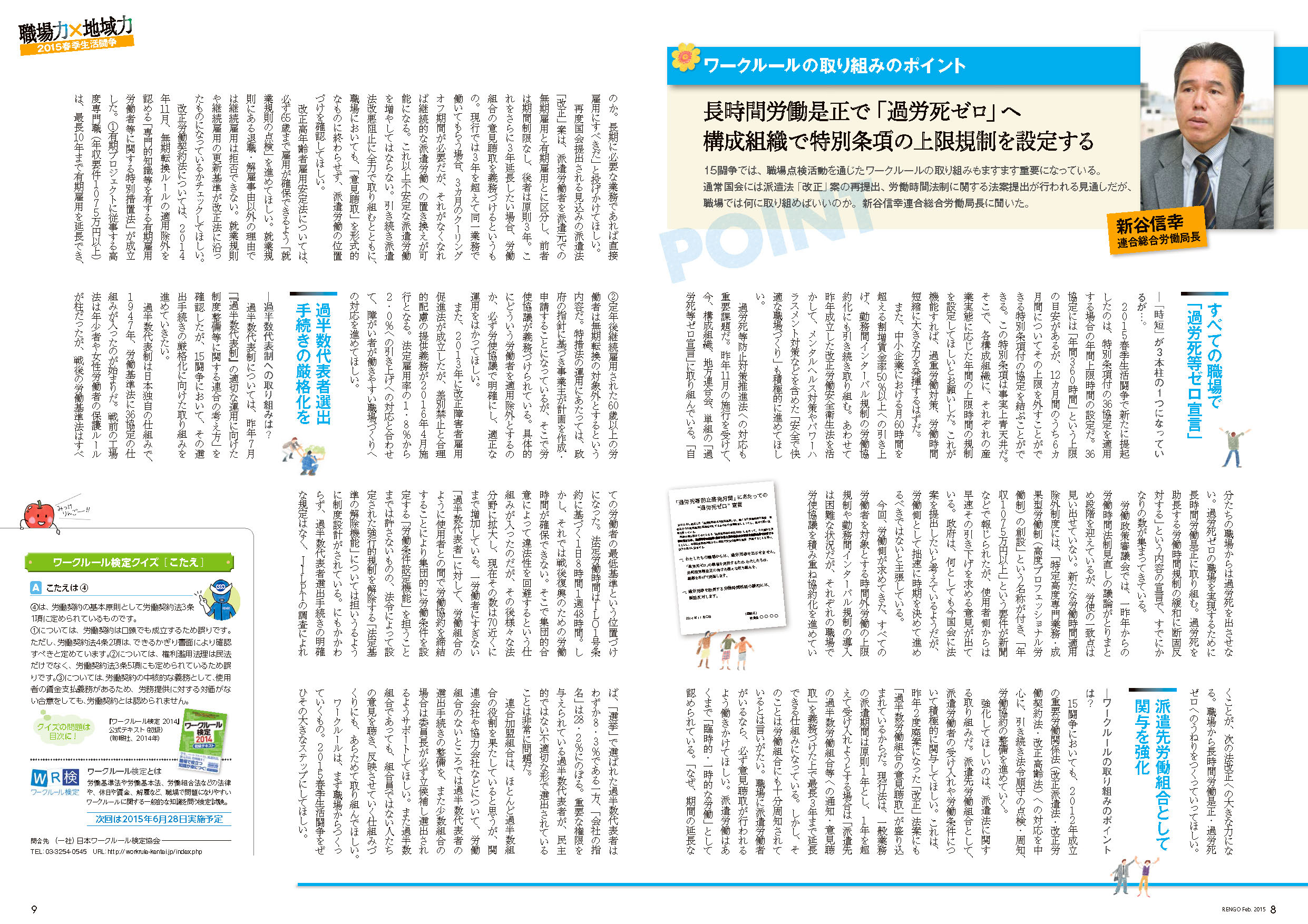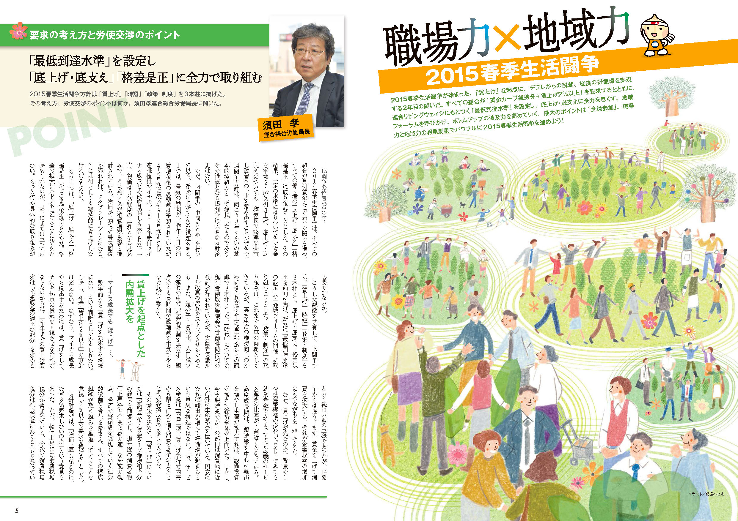 2015春季生活闘争が始まった。「賃上げ」を起点に、デフレからの脱却、経済の好循環を実現する2年目の闘いだ。すべての組合が「賃金カーブ維持分+賃上げ2%以上」を要求するとともに、連合リビングウェイジにもとづく「最低到達水準」を設定し、底上げ・底支えに全力を尽くす。地域フォーラムを呼びかけ、ボトムアップの波及力を高めていく。最大のポイントは「全員参加」。職場力と地域力の相乗効果でパワフルに2015春季生活闘争を進めよう!