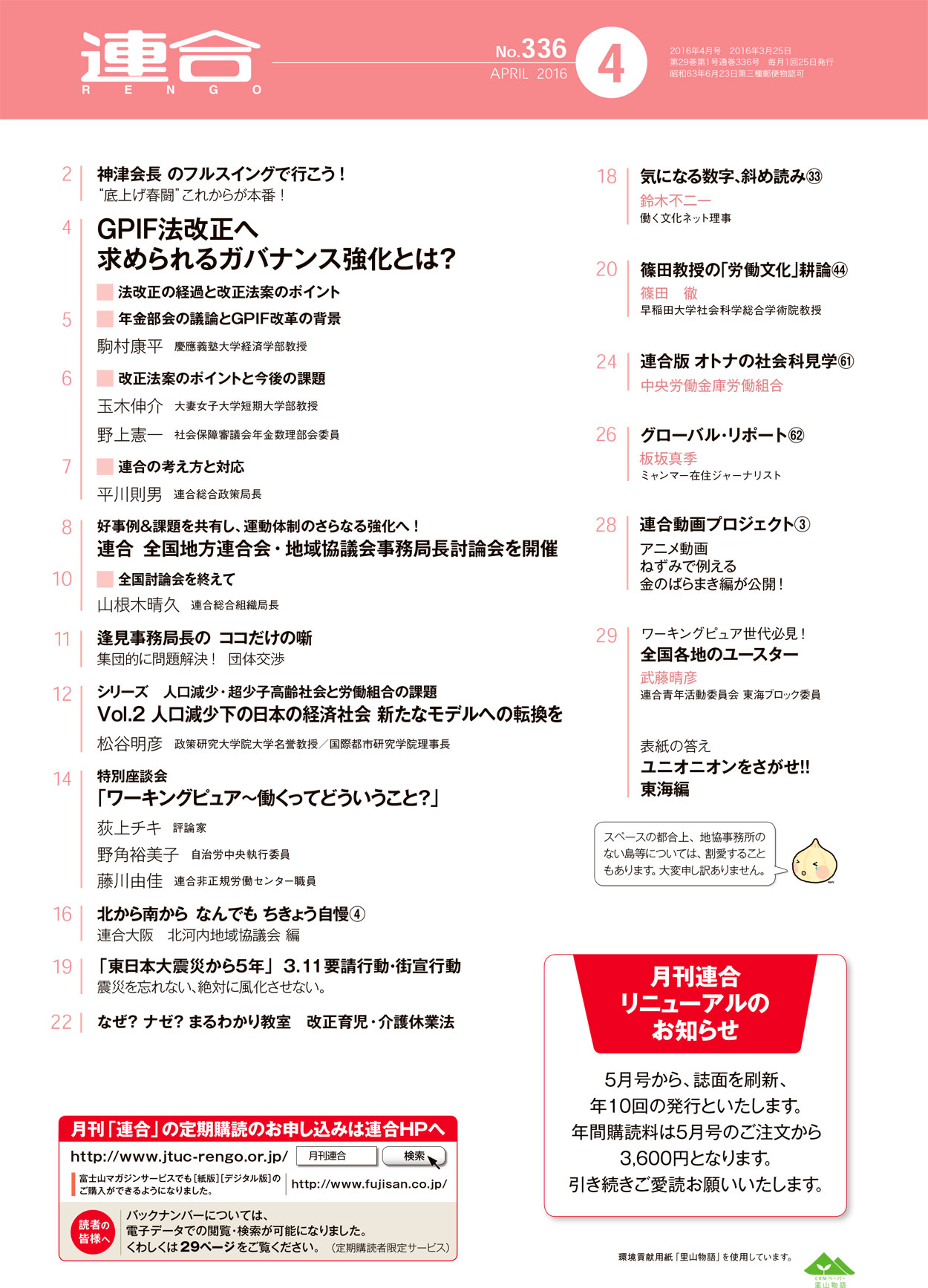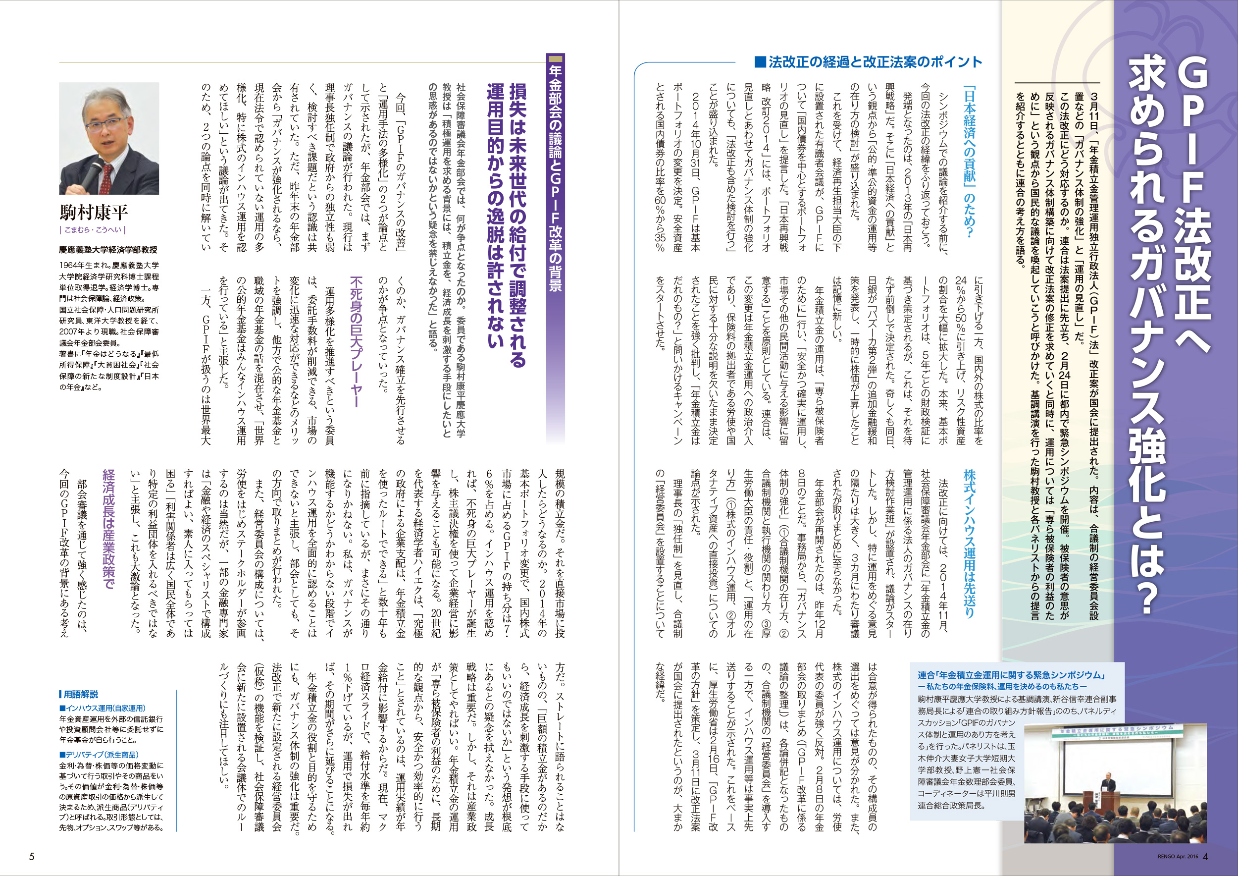 この法改正にどう対応するのか。連合は法案提出に先立ち、2月24日に都内で緊急シンポジウムを開催。被保険者の意思が反映されるガバナンス体制構築に向けて改正法案の修正を求めていくと同時に、運用については「専ら被保険者の利益のために」という観点から国民的な議論を喚起していこうと呼びかけた。基調講演を行った駒村教授と各パネリストからの提言を紹介するとともに連合の考え方を語る。