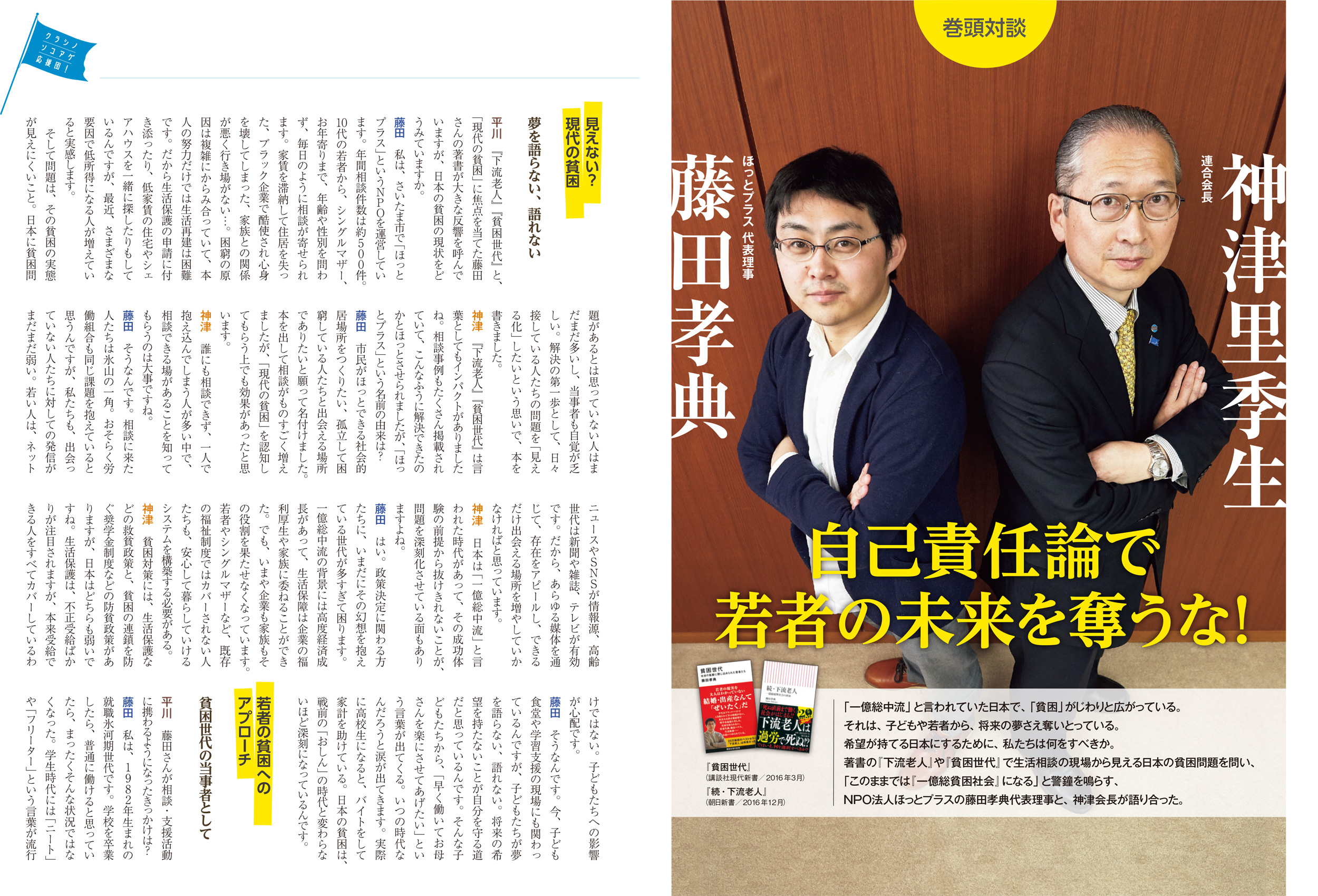 著書の『下流老人』や『貧困世代』で生活相談の現場から見える日本の貧困問題を問い、「このままでは『一億総貧困社会』になる」と警鐘を鳴らす、NPO法人ほっとプラスの藤田孝典代表理事と、神津会長が語り合った。