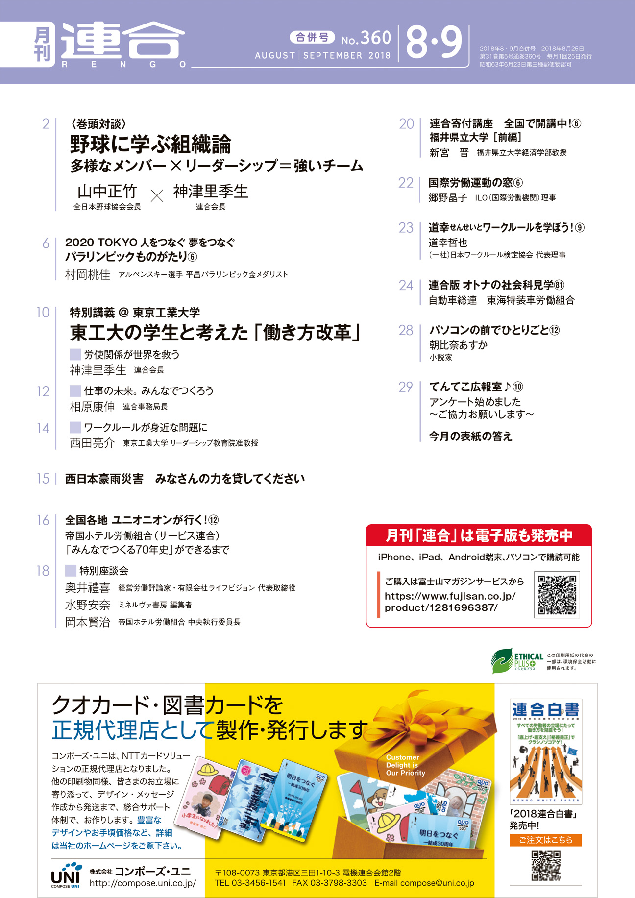 7月上旬、神津会長、相原事務局長が特別講師として東京工業大学の教壇に立った。授業は、西田亮介准教授が担当する「社会学A」で、今期のテーマは「労働と政治」。特別講義としてリクエストされたのは、今最もホットな「働き方改革」をめぐる課題。連合からの問題提起に、学生から鋭い質問が投げかけられた。