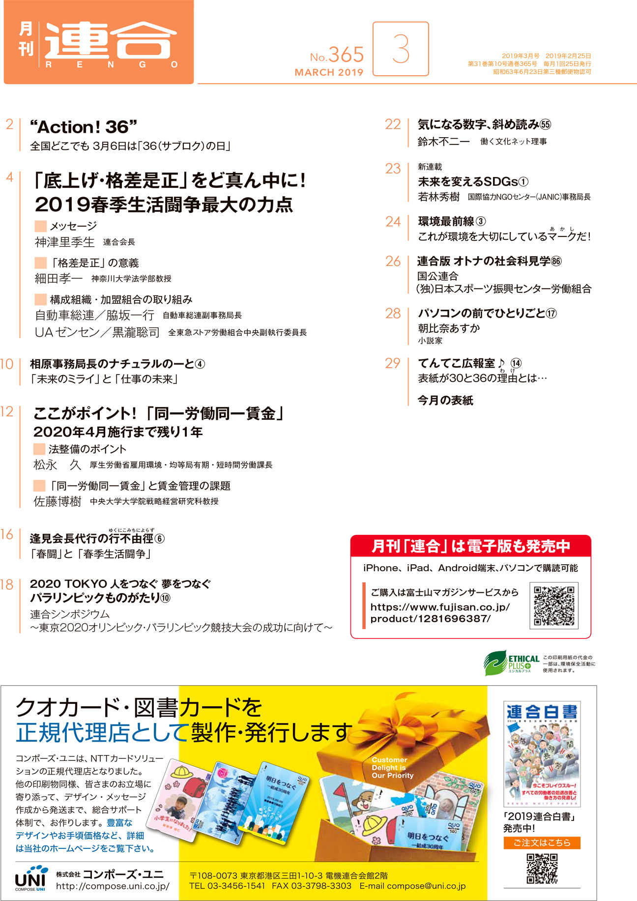 2019春季生活闘争は、企業規模間、雇用形態間、男女間の「格差是正」をど真ん中に据えて、一人ひとりが働いた価値に見合う賃金・処遇が担保される社会の実現をめざす闘いだ。その意義と熱を社会全体に波及させるために、職場・地域で力強く取り組みを進めよう。