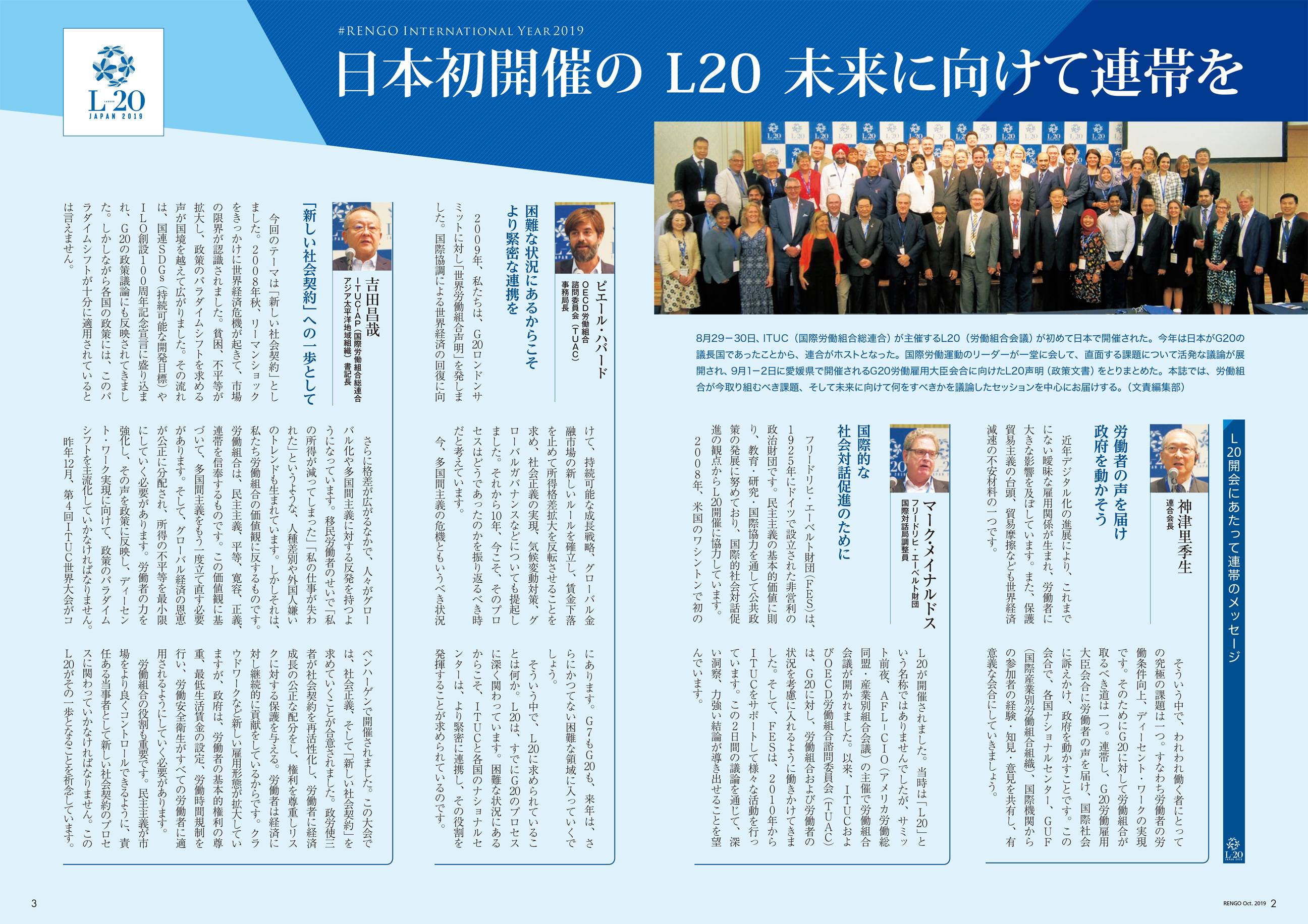 8月29−30日、ITUC(国際労働組合総連合)が主催するL20(労働組合会議)が初めて日本で開催された。今年は日本がG20の議長国であったことから、連合がホストとなった。国際労働運動のリーダーが一堂に会して、直面する課題について活発な議論が展開され、9月1−2日に愛媛県で開催されるG20労働雇用大臣会合に向けたL20声明(政策文書)をとりまとめた。本誌では、労働組合が今取り組むべき課題、そして未来に向けて何をすべきかを議論したセッションを中心にお届けする。