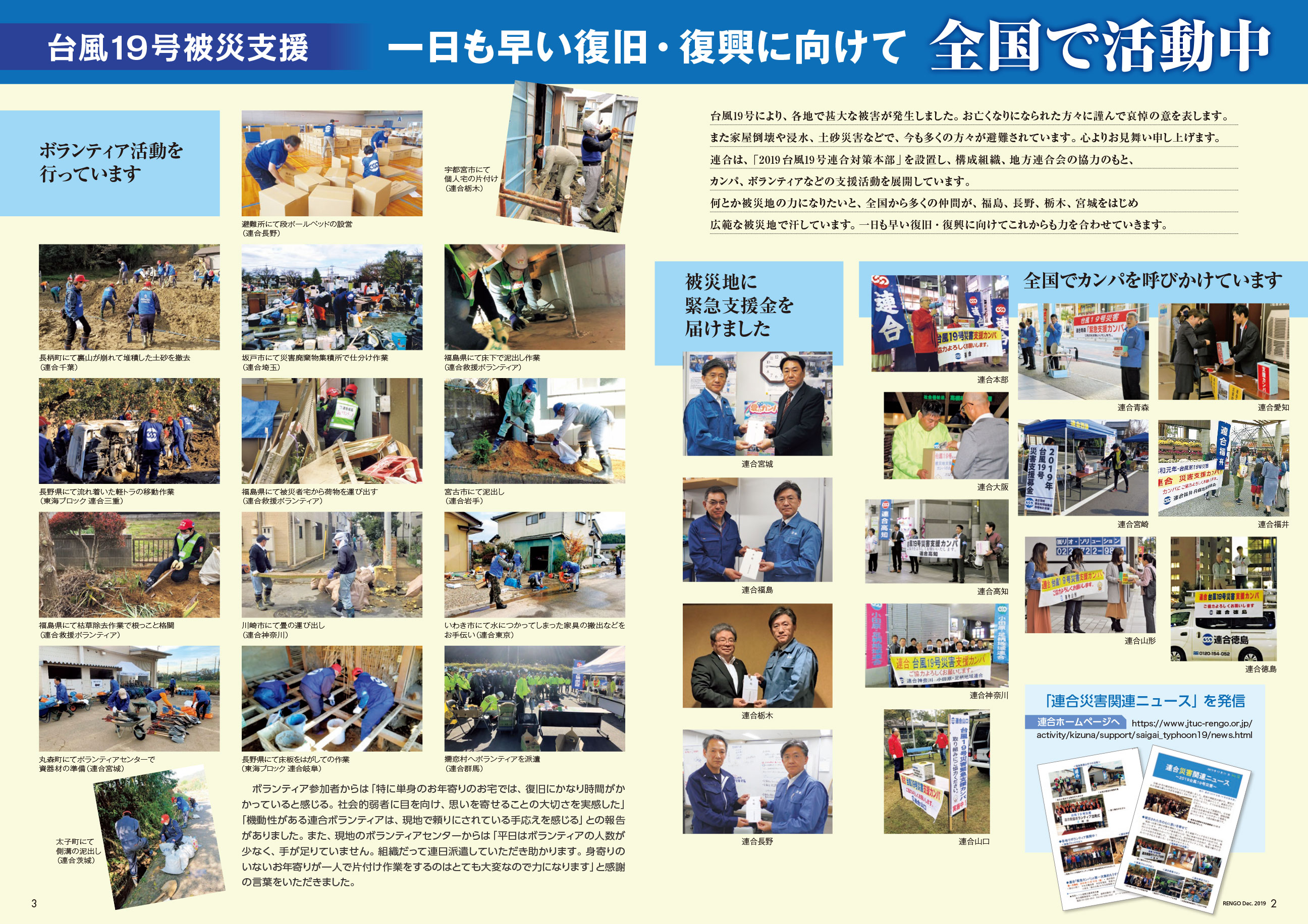 台風19号により、各地で甚大な被害が発生しました。お亡くなりになられた方々に謹んで哀悼の意を表します。また家屋倒壊や浸水、土砂災害などで、今も多くの方々が避難されています。心よりお見舞い申し上げます。連合は、「2019 台風19号連合対策本部」を設置し、構成組織、地方連合会の協力のもと、カンパ、ボランティアなどの支援活動を展開しています。何とか被災地の力になりたいと、全国から多くの仲間が、福島、長野、栃木、宮城をはじめ広範な被災地で汗しています。一日も早い復旧・復興に向けてこれからも力を合わせていきます。