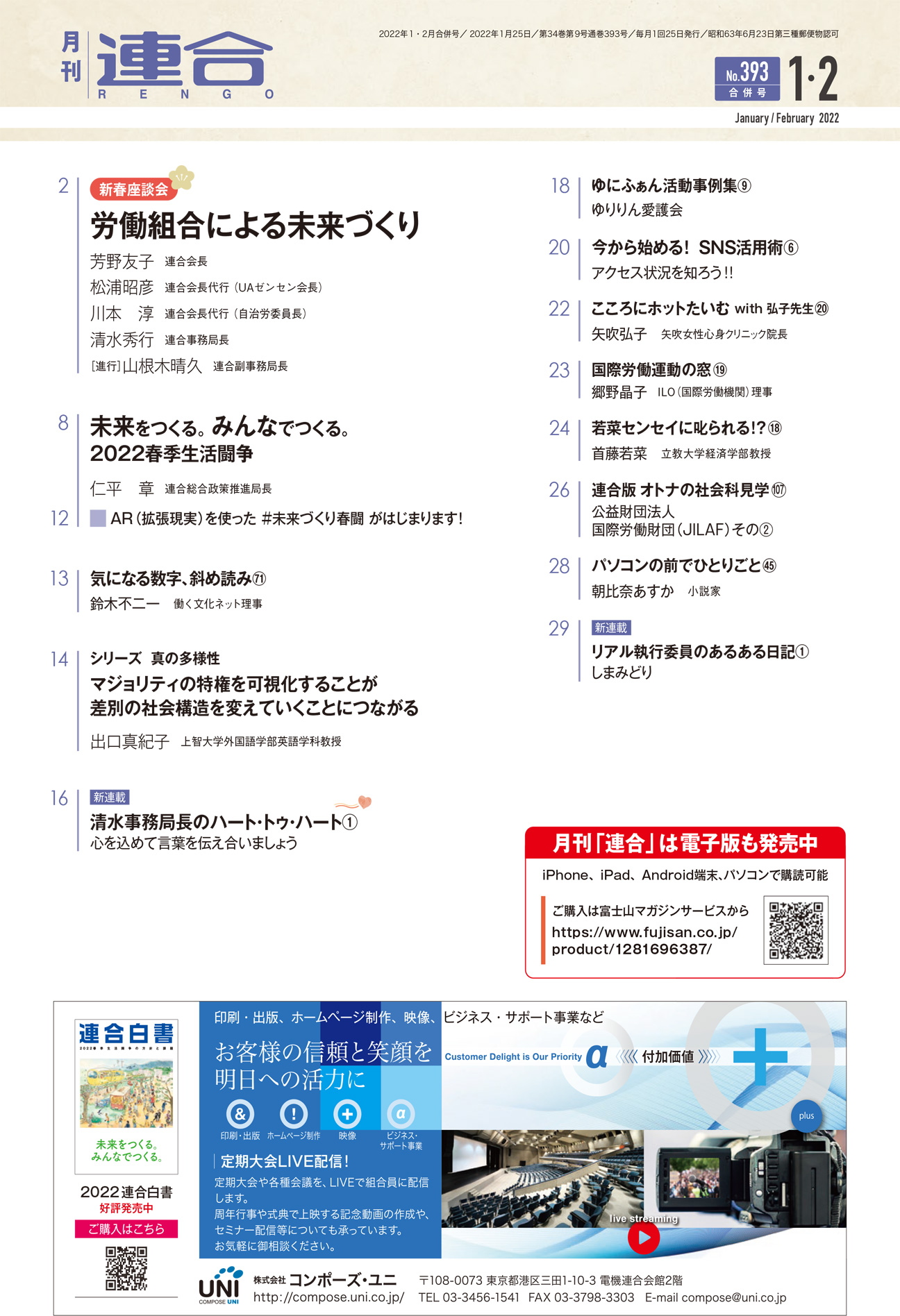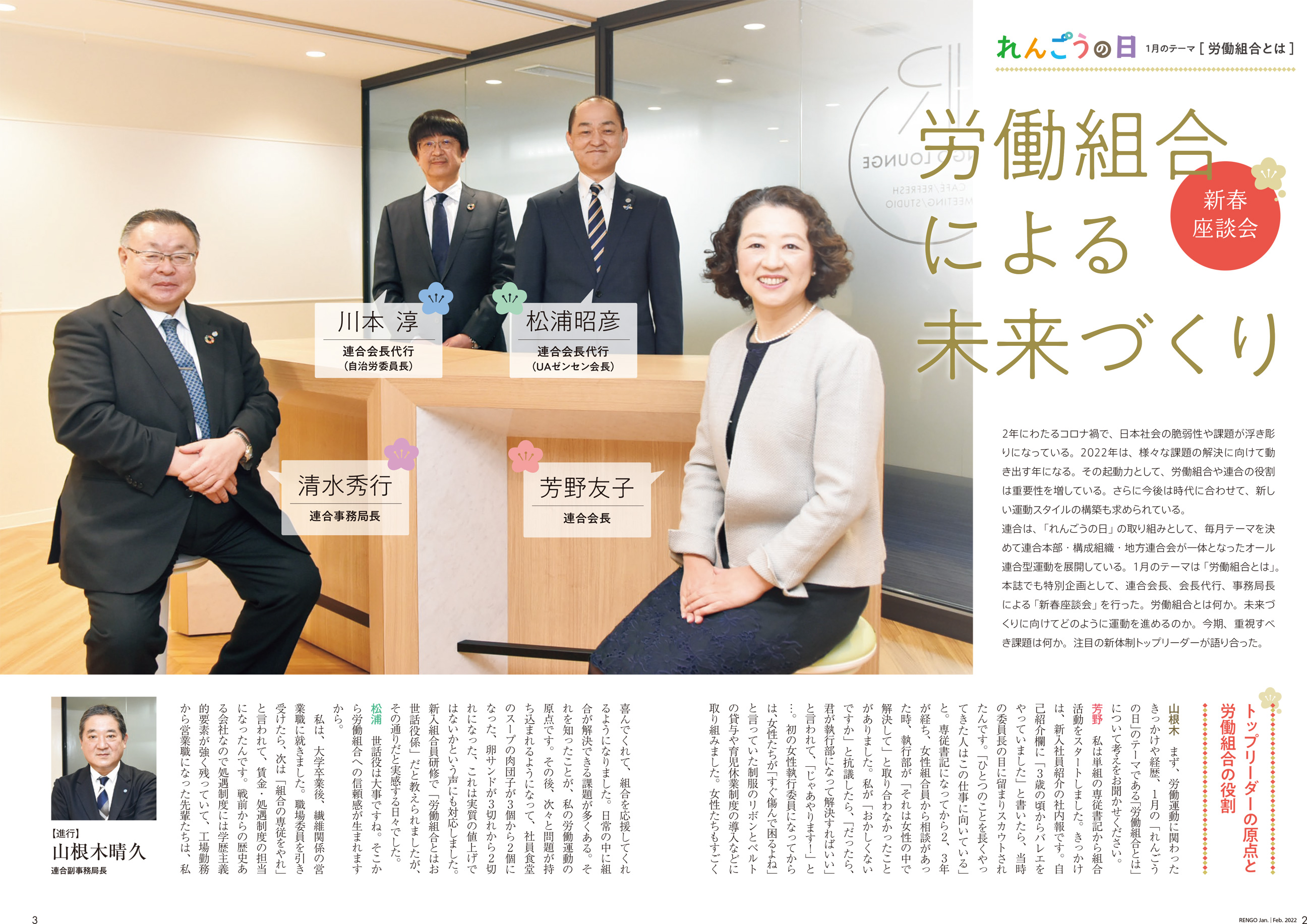 連合は、「れんごうの日」の取り組みとして、毎月テーマを決めて連合本部・構成組織・地方連合会が一体となったオール連合型運動を展開している。1月のテーマは「労働組合とは」。本誌でも特別企画として、連合会長、会長代行、事務局長による「新春座談会」を行った。労働組合とは何か。未来づくりに向けてどのように運動を進めるのか。今期、重視すべき課題は何か。注目の新体制トップリーダーが語り合った。