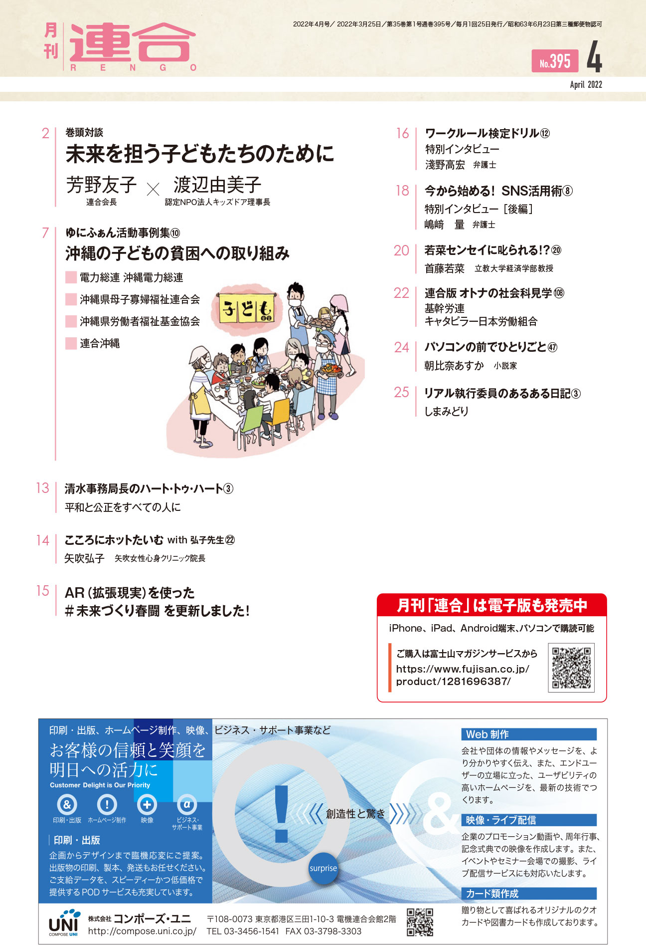 子ども・子育て支援は未来への希望につながるとともに、子どもの笑顔は社会の健全さを示すバロメーターとも言われる。未来を担う子どもたちのために、今、何をしなければならないのか。貧困の連鎖を断ち切るために「無料学習支援」に長く取り組んでいる、認定NPO法人キッズドアの渡辺由美子理事長と芳野友子連合会長が語り合った。