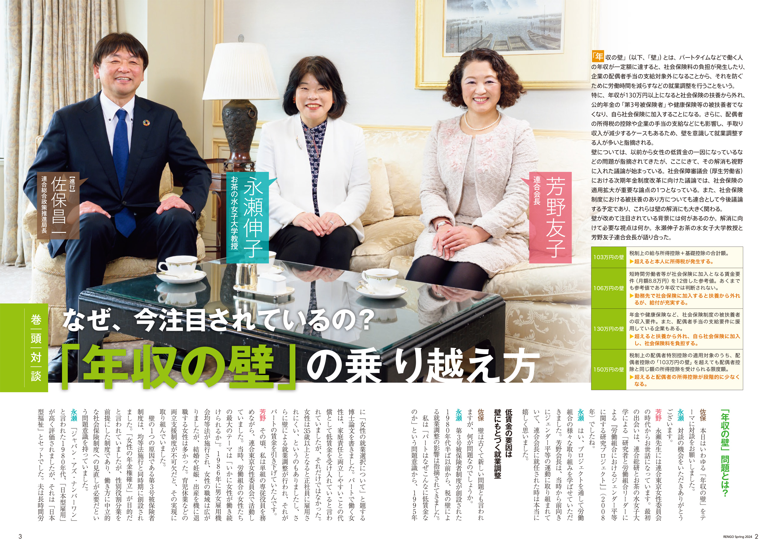 壁が改めて注目されている背景には何があるのか。解消に向けて必要な視点は何か。永瀬伸子お茶の水女子大学教授と芳野友子連合会長が語り合った。