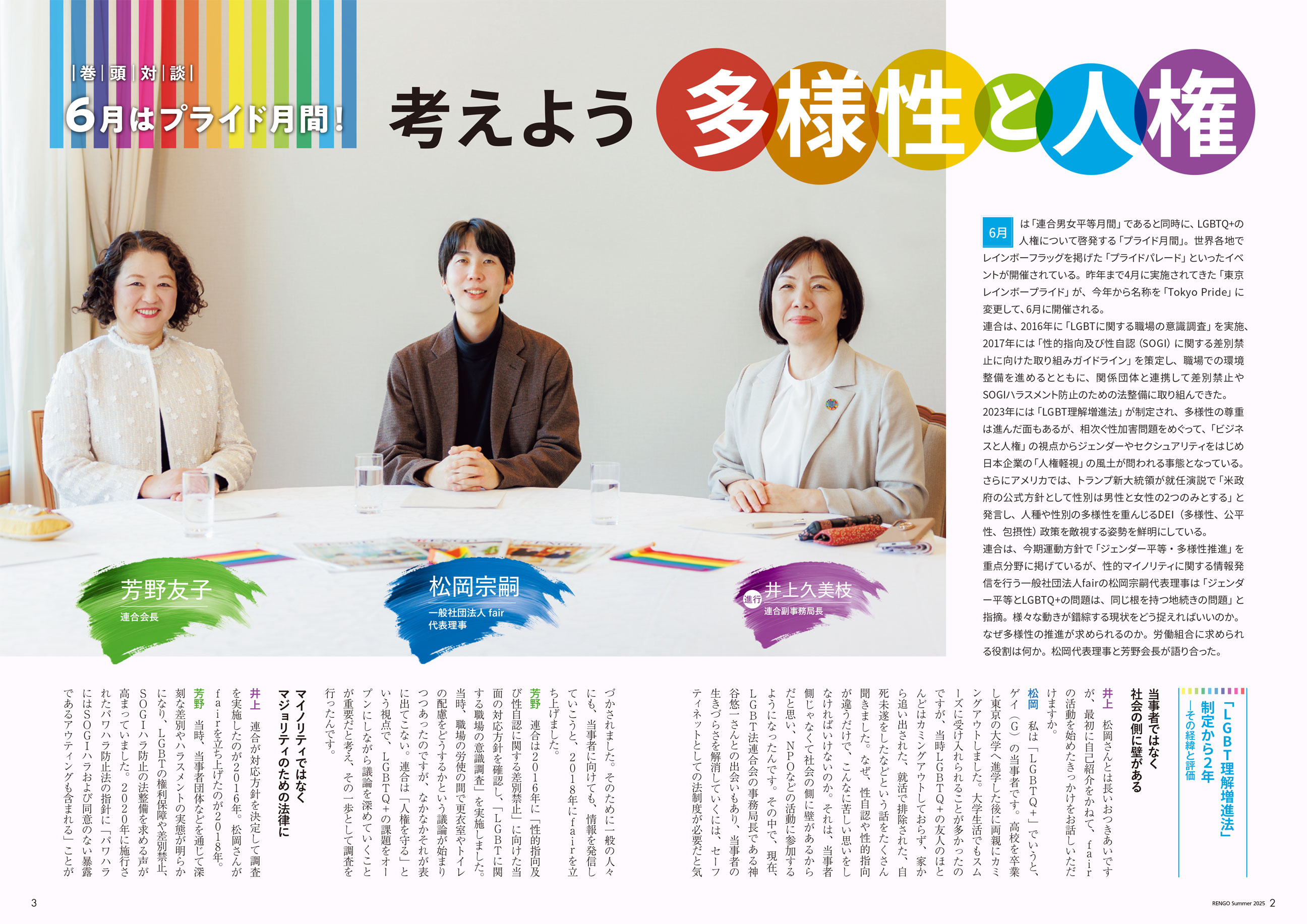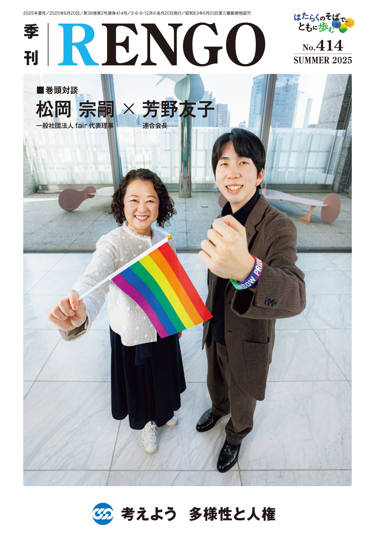 連合は、今期運動方針で「ジェンダー平等・多様性推進」を重点分野に掲げているが、性的マイノリティに関する情報発信を行う一般社団法人fairの松岡宗嗣代表理事は「ジェンダー平等とLGBTQ+の問題は、同じ根を持つ地続きの問題」と指摘。様々な動きが錯綜する現状をどう捉えればいいのか。なぜ多様性の推進が求められるのか。労働組合に求められる役割は何か。松岡代表理事と芳野会長が語り合った。