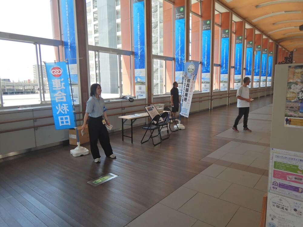 核兵器廃絶による世界の恒久平和の実現に向け、戦争や被爆の実相を伝えるとともに世論喚起の取り組みとして、原爆展を開催した。原爆の投下による建物の倒壊や被爆した人々の状況を伝えるパネルに、来場いただいた方々からは関心を持って見ていただくことができた。合わせて、オンライン署名用QRコードの入ったチラシ入りティッシュを配布しながら核兵器廃絶1000万署名の街頭署名を実施し、多くの方々から署名のご協力をいただいた。