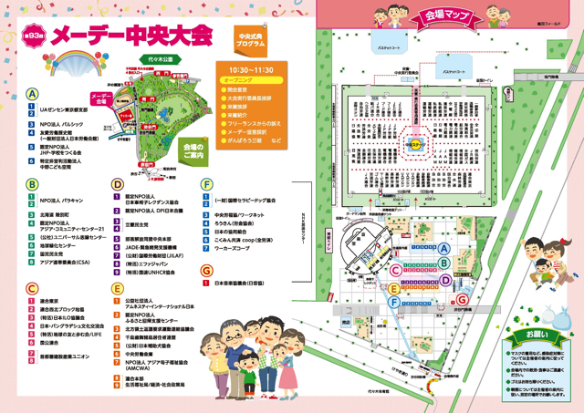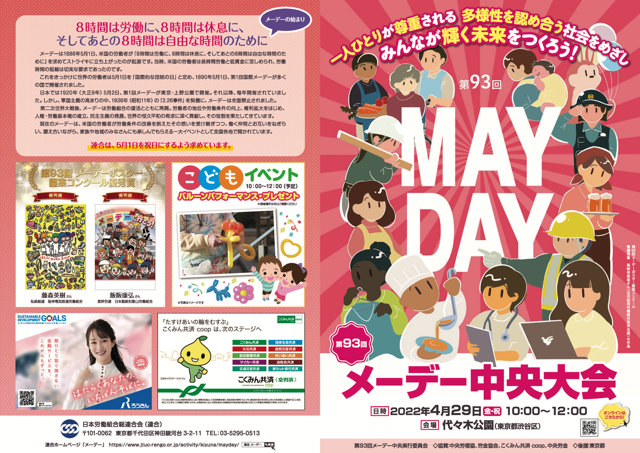 第93回メーデー中央大会の会場案内、中央式典プログラム、会場マップ、出展・出店団体などを掲載したリーフレットが完成いたしました。