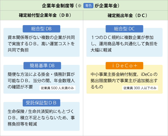 2020年法改正により、DBの支給開始年齢の上限の引き上げ(65歳→70歳)、企業型DCの加入可能年齢の引き上げ(65歳未満→70歳未満、2022年5月施行予定)、中小企業向けDCの対象範囲の拡大(従業員100人以下→300人以下)などが行われました。