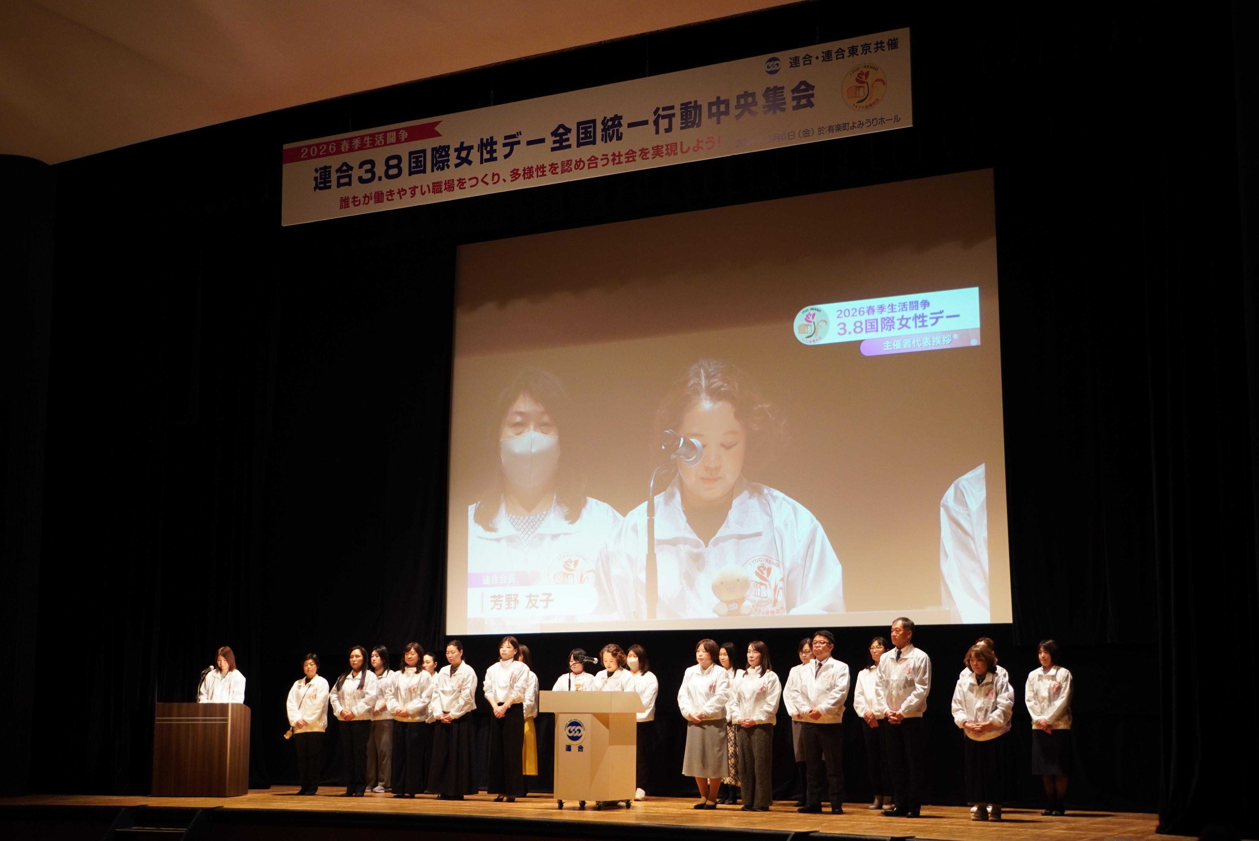 連合は、2026年3月6日(金)、連合東京との共催で「2026春季生活闘争 3.8 国際女性デー 全国統一行動 中央集会」を開催しました。集会は対面とオンラインを併用して行い、対面では構成組織・地方連合会などから708名(女性334名・男性374名)、オンラインでは467アカウントがWeb視聴しました。