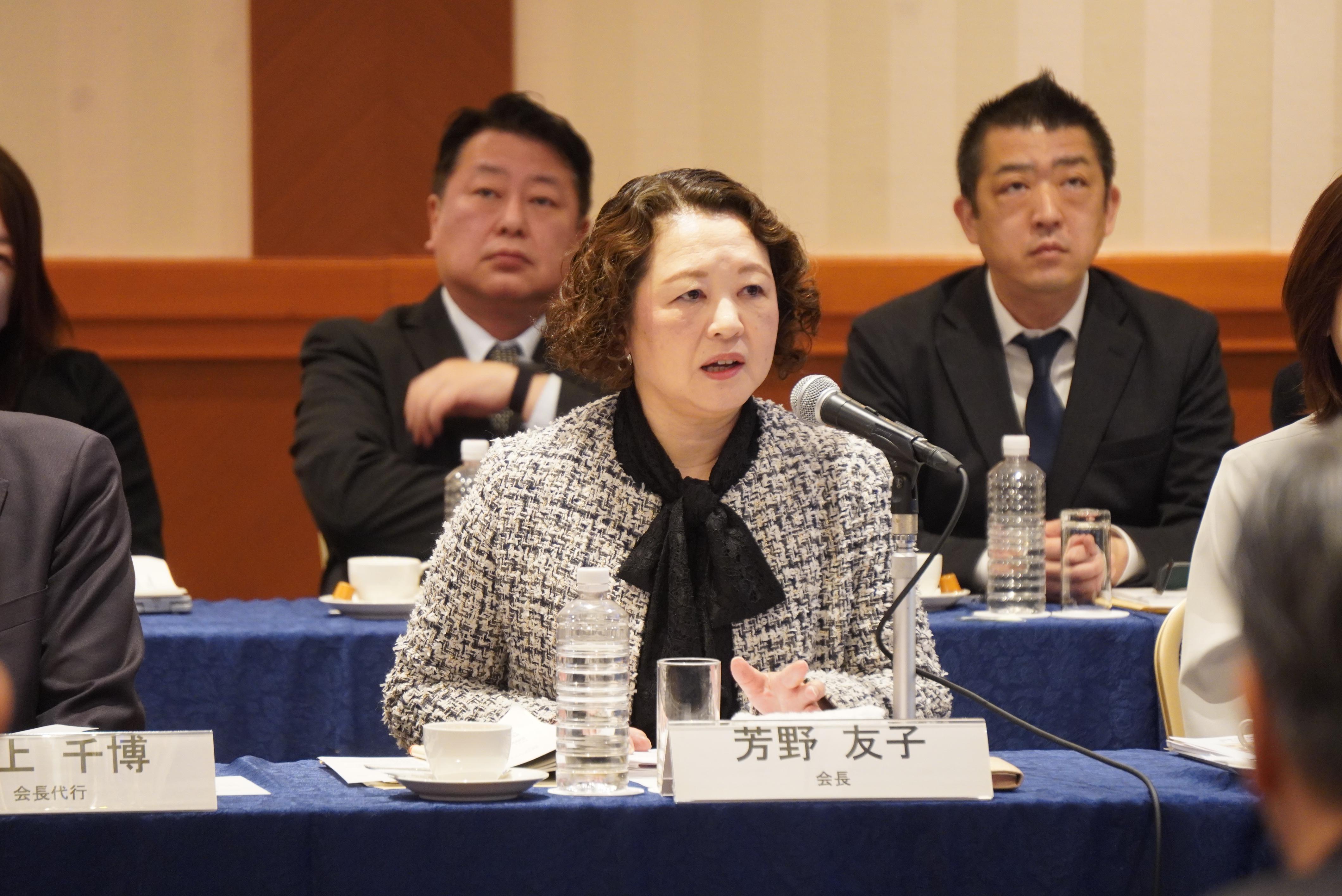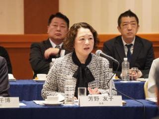冒頭、連合の芳野友子会長は、2026春季生活闘争の第1回回答集計において、3年連続で5%を超える賃上げ水準となっていることに触れ「世界情勢を踏まえた経済の見通しの不透明感が強い中で、その影響を受けやすい中小・小規模事業所においても、しっかりと賃上げができるようにするためには、価格転嫁をはじめとするサプライチェーンにおける取引の適正化が重要である。経済界のトップリーダーのイニシアティブを発揮いただくようお願いする」と述べました。また、政府が3月13日に閣議決定した第6次男女共同参画基本計画に関連して「旧姓使用の拡大は、本質的な課題を解決するものではなく、選択的夫婦別氏制度の導入こそが唯一の解決策である。経済同友会と連合とは認識を共有しているものと受け止めており、引き続き、制度の導入に向けて連携をお願いしたい」と挨拶しました。