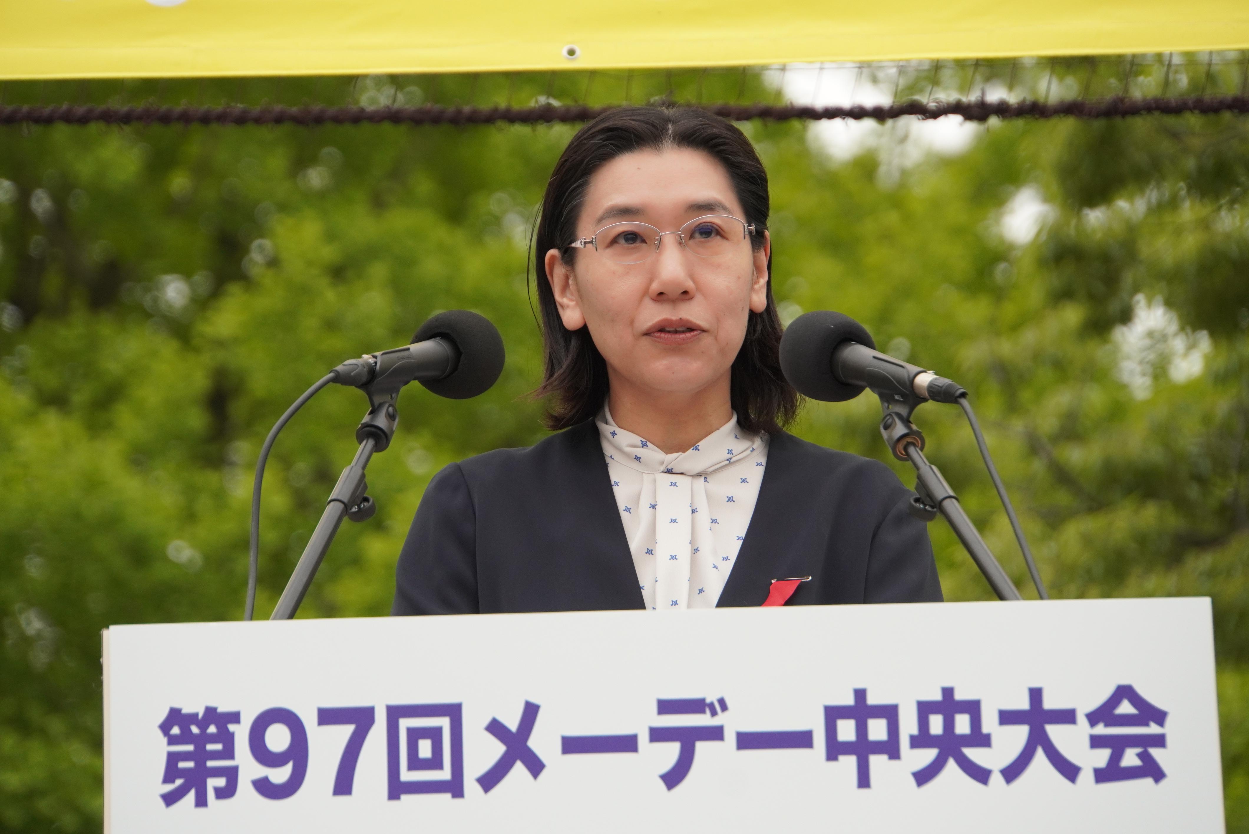 中央式典は、斉藤千秋中央実行副委員長(連合東京会長)による開会宣言で始まり、芳野友子中央実行委員長(連合会長)が主催者を代表して、メーデー創始から140年、戦後80年が過ぎても争いが止まない現状に触れ、「平和を希求する訴えが広がる中で、労働組合の取り組みは本当に社会を巻き込む共感を得ているだろうか。今こそ一人ひとりがジブンゴトとして平和の実現に向けた思いを一つにし、行動に移すことが大切だ」と述べました。また、与謝野晶子の歌を引用し、既存の枠組みを超えて共感を呼ぶ「新しいかたちの運動」の重要性を強調し、労働組合がその大きなうねりの中心となるべきだと語りました。2026春季生活闘争については、「3年連続5%以上の賃上げ率を実現したが、実質賃金がプラス基調に定着するにはまだまだである」と現状の厳しさを指摘。その上で、労働者への分配が伸び悩んでいる状況に対し、「長時間労働による生産性向上という140年以上も前の轍を踏むような精神論的手法ではなく、まずは積み上げてきた労働の価値を認め、それに十分に報いることを実行に移していただきたい」と強く訴えました。さらに、今後の展望について、「対話を通じてお互いを理解し、尊重し合うことでしか『誰もが平和で笑顔あふれる毎日』は実現できない。すべての働く仲間が笑顔で暮らせる社会を築くため、今一度、心合わせ、力合わせをしましょう」と力強く連帯を呼び掛けました。