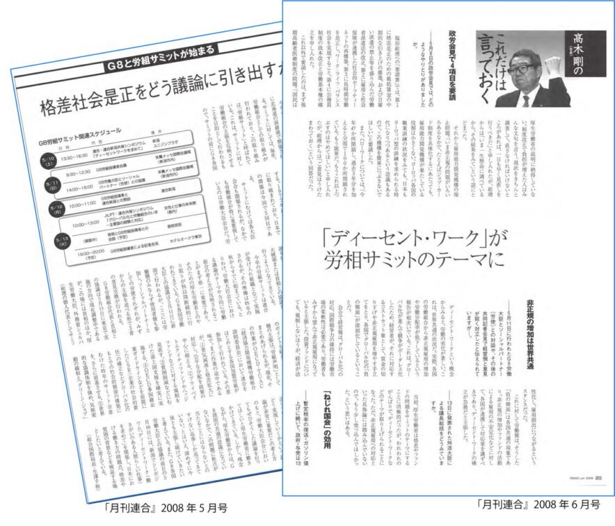 こうした流れの中で、連合がホスト組織を務めることになったのが、2008年のG8北海道洞爺湖サミットに向けたレイバーサミットだった。これは同年5月11日にG8労働大臣会合が行われた新潟で開催されている。