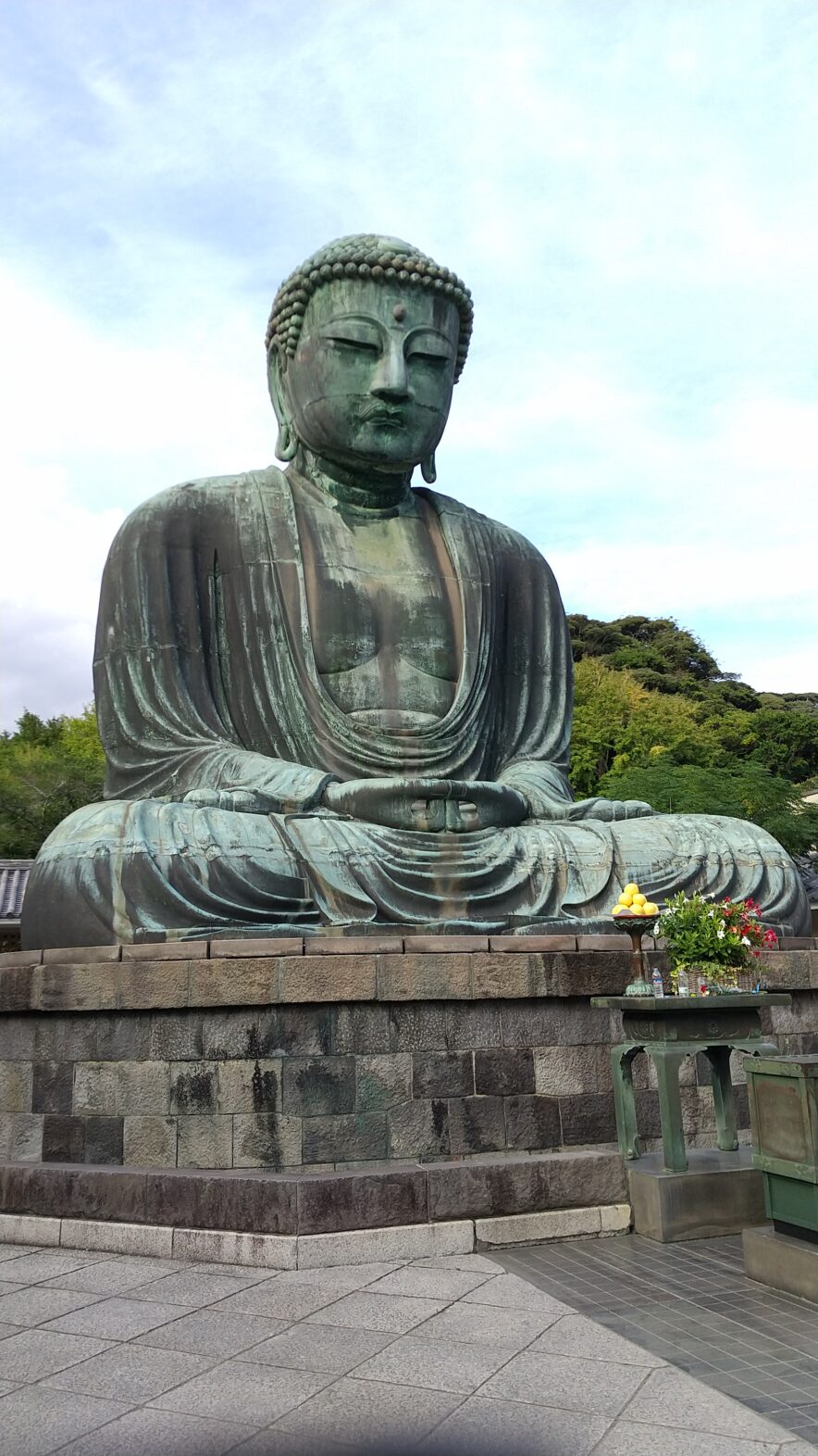 最後に訪れた高徳院には、鎌倉大仏の名で親しまれている本尊の阿弥陀如来坐像がある。歴史書の『吾妻鏡』には、1238年から建立が始められ5年後に開眼供養が行われたとの記載があるが、この時の大仏は銅造ではなく木造であったとされている。また、『吾妻鏡』には、1252(建長4)年から10年前後の歳月をかけて造立された記載もあり、現存する鎌倉大仏はこちらであるとみられている。大仏は、元来は大仏殿のなかに安置されていたが、後醍醐天皇の建武の新政が始まる1334(建武元)年と、室町時代の1369年の大風で損壊したとされ、それ以来、露座(ろざ・屋外にすわっていること)の大仏となっていて、数ある鎌倉の仏像の中で、ほぼ造像当初の姿を保っている点も貴重ということで、唯一、国宝の指定を受けている。歌人の与謝野晶子の「かまくらや みほとけなれど 釈迦牟尼(しゃかむに)は 美男におはす 夏木立かな」の歌碑がある。