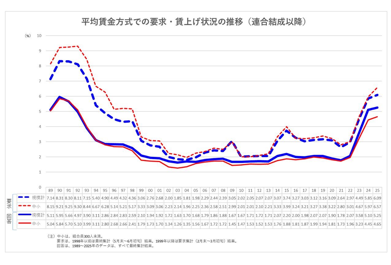 1990年代半ばから物価も賃金も上がらないデフレが続いた。「物価が上がらないなら賃金が上がらなくても仕方ない」というデフレマインドが社会を覆い、日本の賃金水準は先進国で最下位レベルに低下した。この流れを断ち切るために連合が提起したのが「未来づくり春闘」だ。経済成長や企業業績の後追いではなく、「人への投資」を起点として経済の好循環を実現していくことを掲げ、賃上げを要求。2023春季生活闘争では3%台、2024・2025春季生活闘争では5%台の賃上げを実現した。