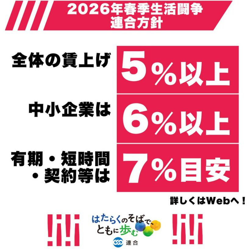 このため2026年は、目標こそ前年と同じ5%ですが、「実現にこだわる」ことを打ち出しました。連合の加盟組合が、5%以上の賃上げにこだわり確実に達成することで、中小の職場や組合のない職場に賃上げを波及させるという、強い意思を示したのです。そのためには企業規模や雇用形態による賃金格差の是正も不可欠なため、中小組合は6%、非正規雇用で働く人たちについては7%と、全体目標よりも高い引上げ目安を掲げています。