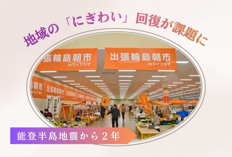 一方、自宅を再建して戻った人から、「ご近所さんがまだ戻ってきていないため、仮設住宅にいた方がコミュニティに入りやすい」との声も寄せられる。自宅に戻った人たちの交流をサポートすることでコミュニティの活性化につなげていきたい。 - 輪島朝市は現在、「出張朝市」という形でショッピングセンター内に出店している。輪島朝市通り周辺は更地となっているが、今春から道路や住宅の建築工事が始まると聞いており、ようやく復興の兆しが見えてきた。