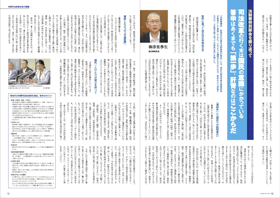 7月9日、法制審議会「新時代の刑事司法制度特別部会」は「新たな刑事司法制度の構築についての調査審議の結果」として、重大事件(裁判員裁判対象事件、検察独自捜査事件)の「取調べ全過程の録音・録画」の義務化を答申した。
