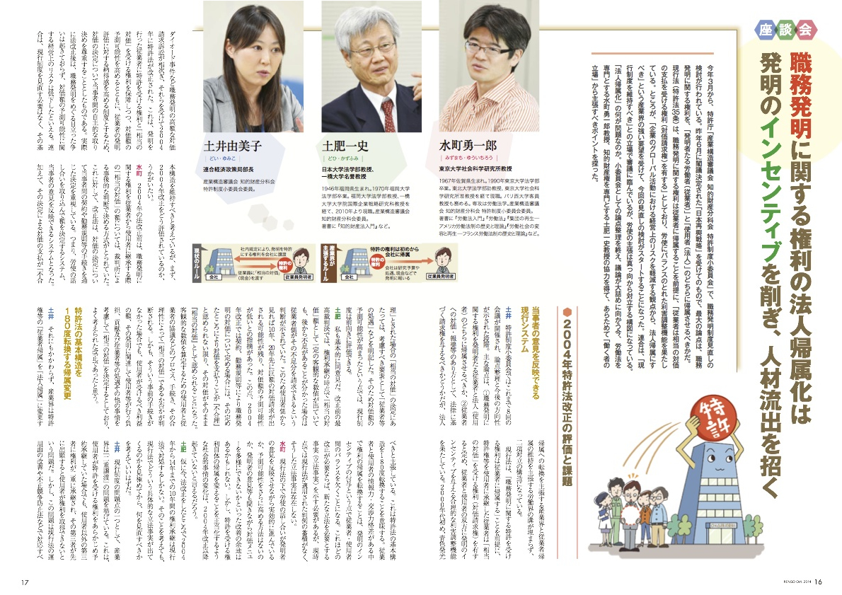 「法人帰属化」の何が問題なのか。小委員会としての論点整理を終え、議論が大詰めに向かう今、労働法を専門とする水町勇一郎教授、知的財産権を専門とする土肥一史教授の協力を得て、あらためて「働く者の立場」から主張すべきポイントを探った。