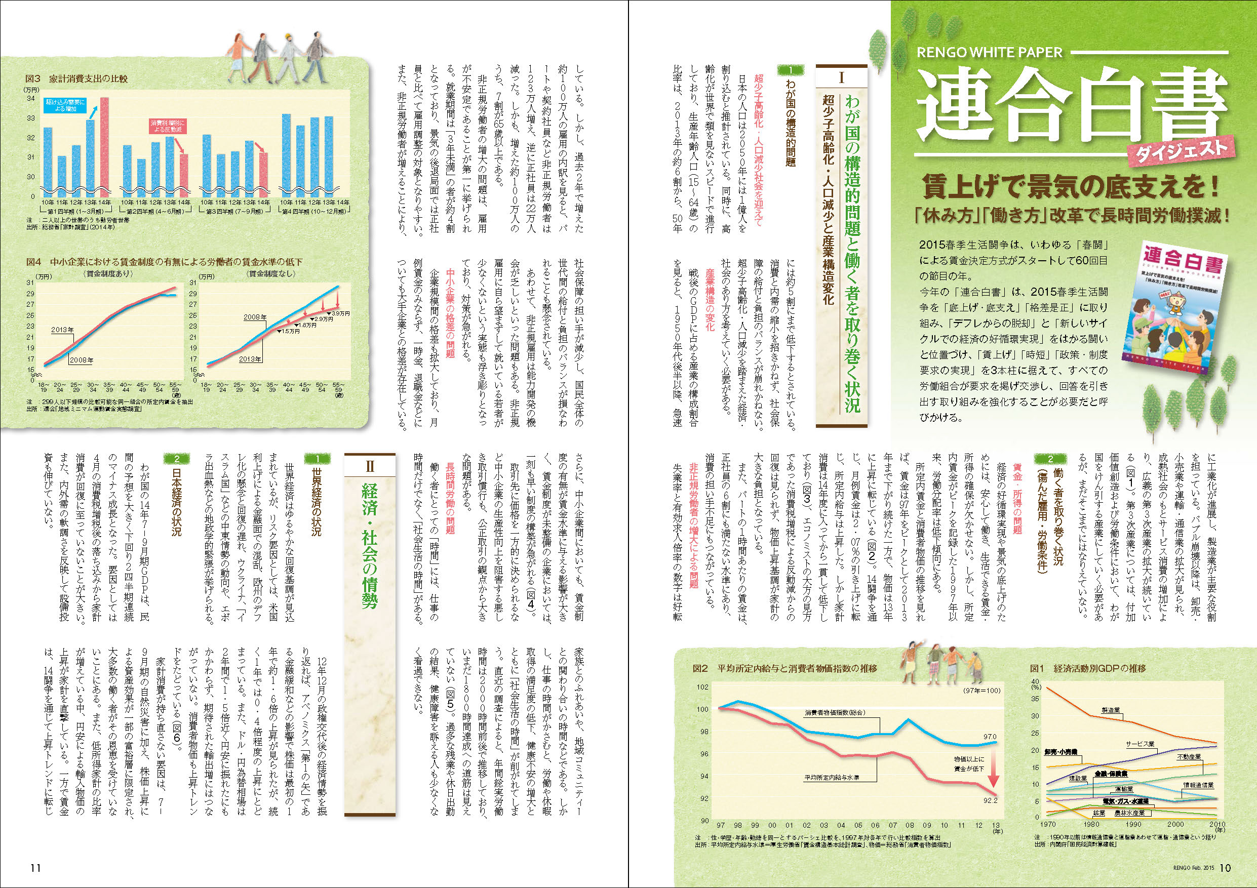 今年の「連合白書」は、2015春季生活闘争を「底上げ・底支え」「格差是正」に取り組み、「デフレからの脱却」と「新しいサイクルでの経済の好循環実現」をはかる闘いと位置づけ、「賃上げ」「時短」「政策・制度要求の実現」を3本柱に据えて、すべての労働組合が要求を掲げ交渉し、回答を引き出す取り組みを強化することが必要だと呼びかける。