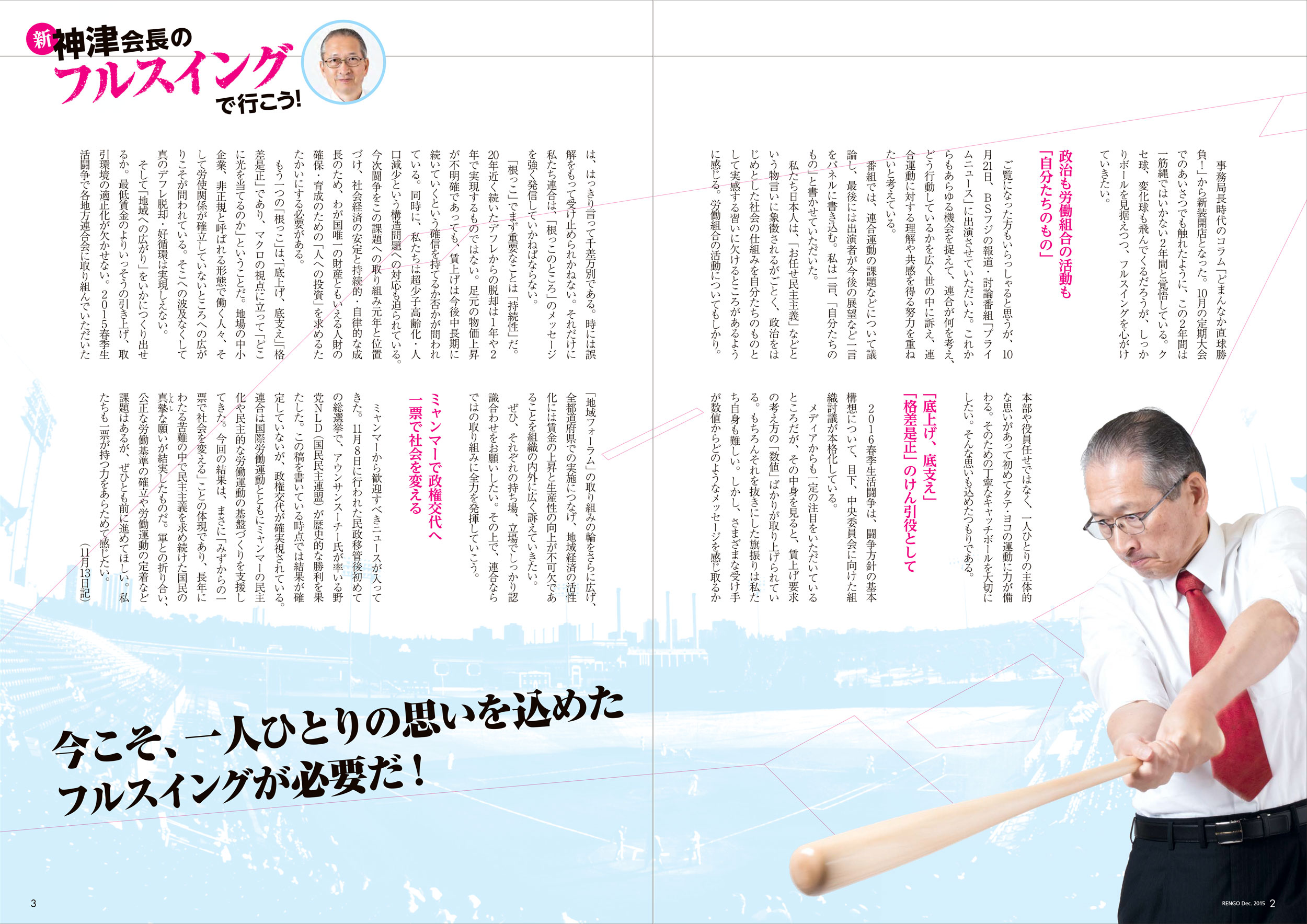 事務局長時代のコラム「どまんなか直球勝負!」から新装開店となった。10月の定期大会でのあいさつでも触れたように、この2年間は一筋縄ではいかない2年間と覚悟している。クセ球、変化球も飛んでくるだろうが、しっかりボールを見据えつつ、フルスイングを心がけていきたい。