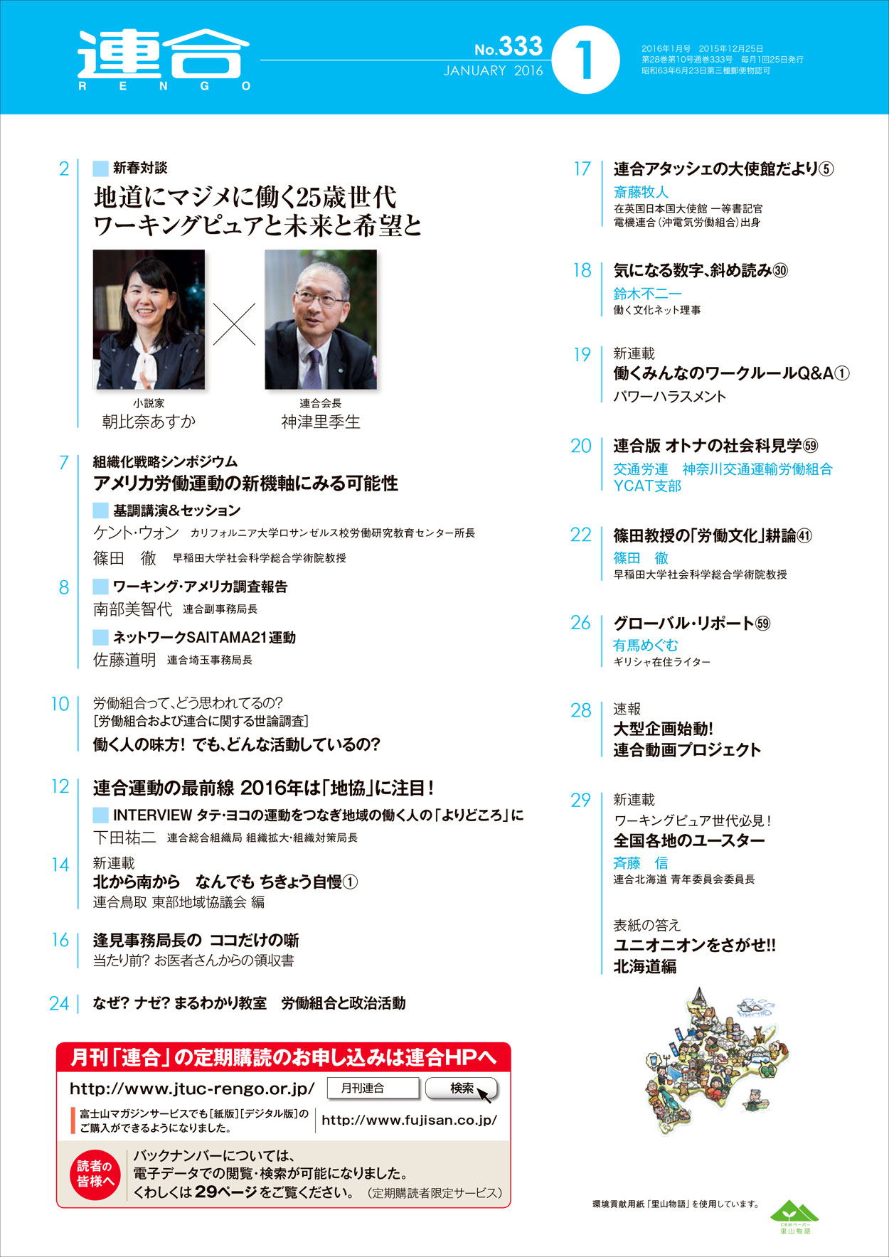 連合が結成25年を記念して企画・制作した書籍『ワーキングピュア白書―地道にマジメに働く25歳世代』。純粋に仕事に取り組むワーキングピュアが直面している、長時間労働、サービス残業、低賃金、パワハラなどの労働環境の問題に対し、労働組合はどう行動すべきか。小説家の朝比奈あすかさんと神津連合会長が語り合った。
