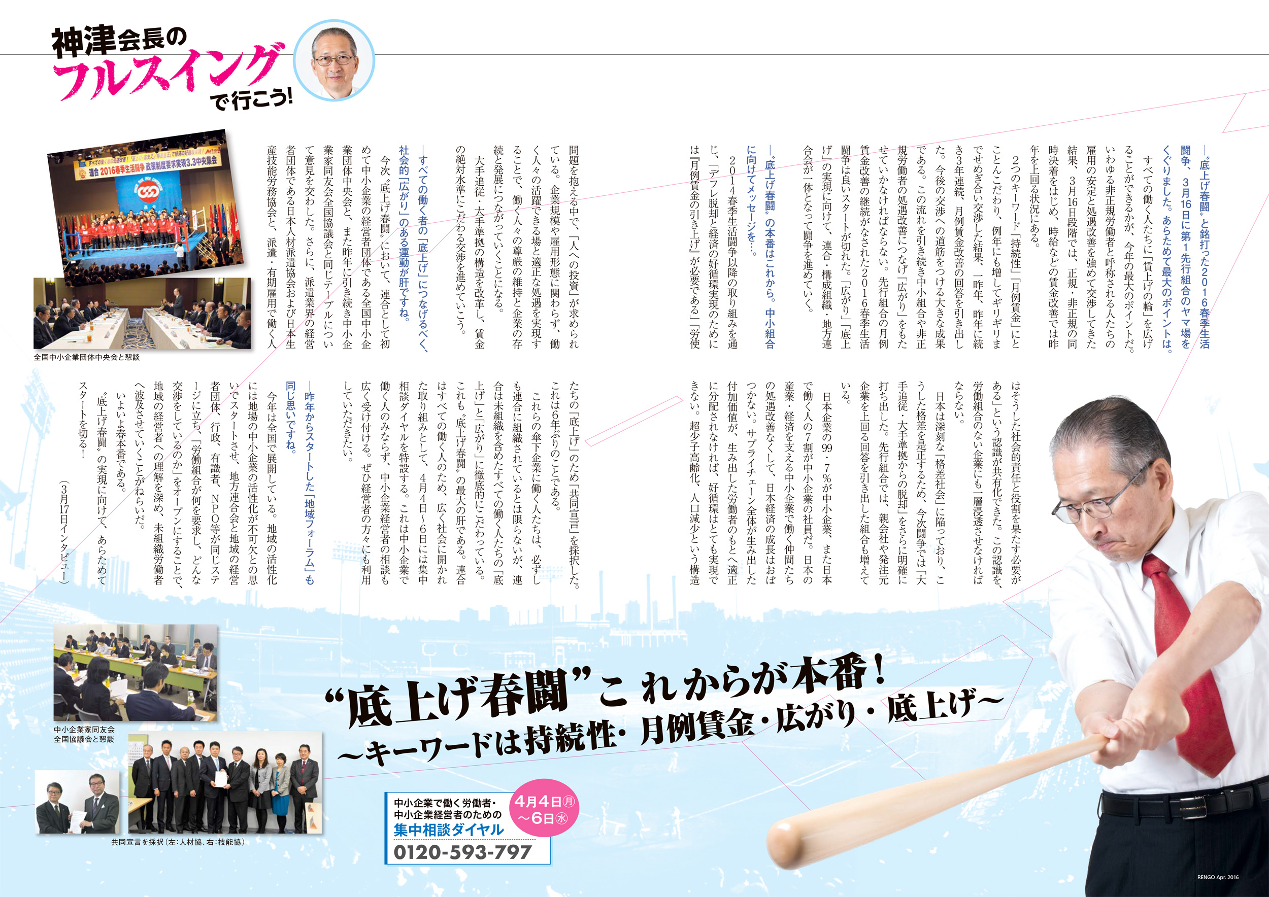 2016春季生活闘争のキーワードは、「持続性」「月例賃金」「底上げ」「広がり」。デフレ脱却に向けた社会全体への波及という点において、地域運動の担う役割はきわめて大きい。