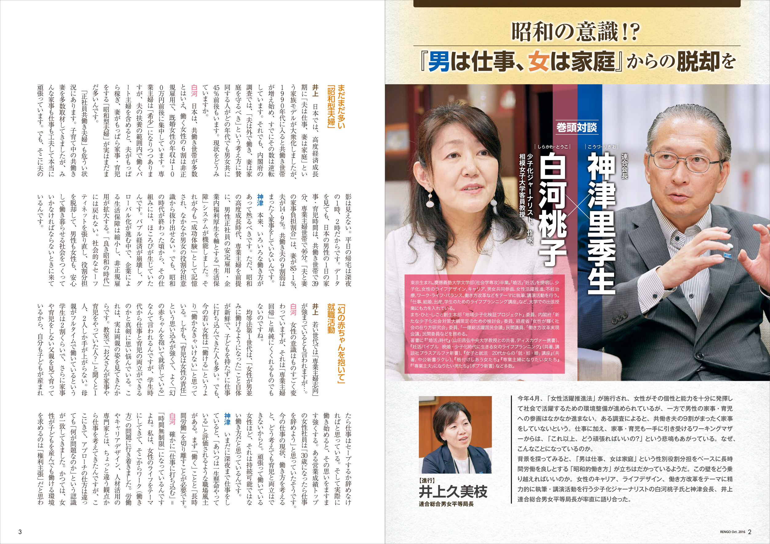 背景を探ってみると、「男は仕事、女は家庭」という性別役割分担をベースに長時間労働を良しとする「昭和的働き方」が立ちはだかっているようだ。この壁をどう乗り越えればいいのか。女性のキャリア、ライフデザイン、働き方改革をテーマに精力的に執筆・講演活動を行う少子化ジャーナリストの白河桃子氏と神津会長、井上連合総合男女平等局長が率直に語り合った。