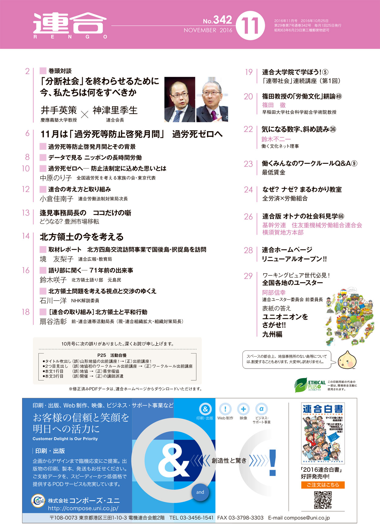2014年11月に施行された「過労死等防止対策推進法」。同法は「過労死等が多発し大きな社会問題となっている」との認識の下、その対策推進と調査研究を国・自治体の責務と位置づけ、また広く国民の関心と理解を深めるために、毎年11月を「過労死等防止啓発月間」と規定した。働きすぎで命を落とす人は年間200人を数える。「過労死等防止啓発月間」を迎えて、労働組合にはどんな取り組みが求められているのか。過労死ゼロへ、長時間・過重労働対策のポイント、労働組合の役割を探った。