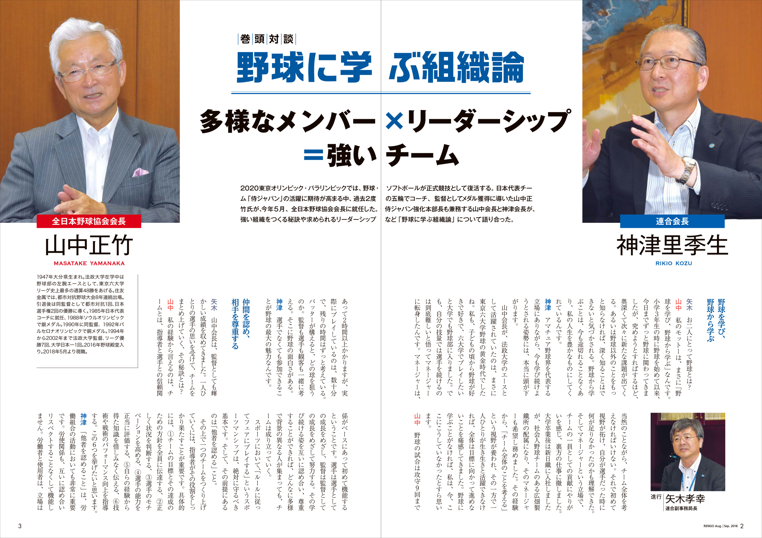 2020東京オリンピック・パラリンピックでは、 野球・ソフトボールが正式競技として復活する。日本代表チーム「侍ジャパン」の活躍に期待が高まる中、過去2度の五輪でコーチ、監督としてメダル獲得に導いた山中正竹氏が、今年5月、全日本野球協会会長に就任した。侍ジャパン強化本部長も兼務する山中会長と神津会長が、強い組織をつくる秘訣や求められるリーダーシップなど「野球に学ぶ組織論」について語り合った。