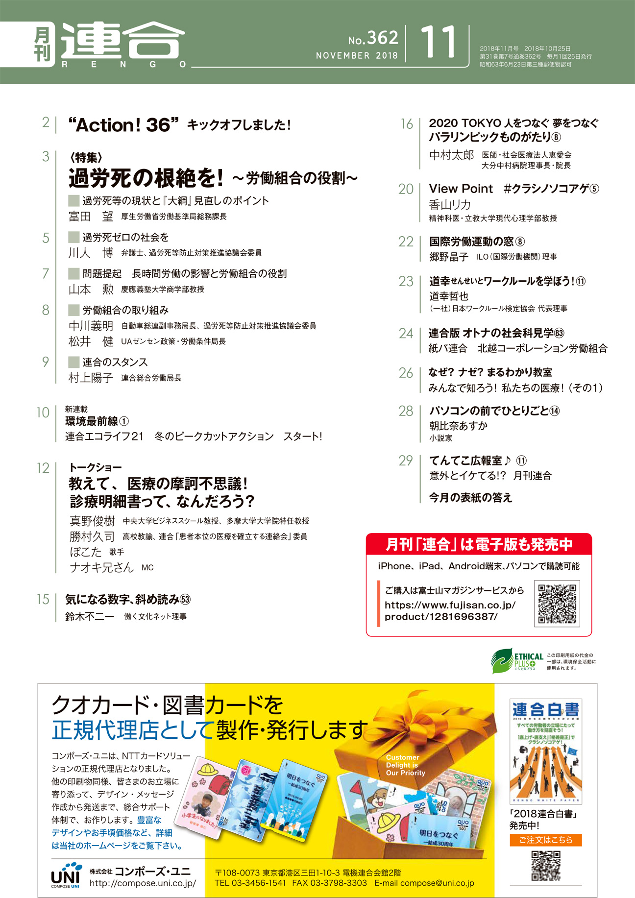 11月は「過労死等防止啓発月間」だ。2014年に成立した過労死等防止対策推進法で設定されたものであり、「二度と働き過ぎでいのちを落とす人がないように」という遺族や支援者の痛切な思いが込められている。法施行から3年が経過した今年は、対策強化に向けて「過労死等の防止のための対策に関する大綱」の改定が行われ、勤務間インターバル制度導入割合を含む数値目標が示され、労働組合の役割についても踏み込んだ記述がなされた。過労死ゼロへ、何ができるのか、何をすべきなのか。過労死等防止啓発月間に何を訴えるのか。労働組合の役割をあらためて考えよう。
